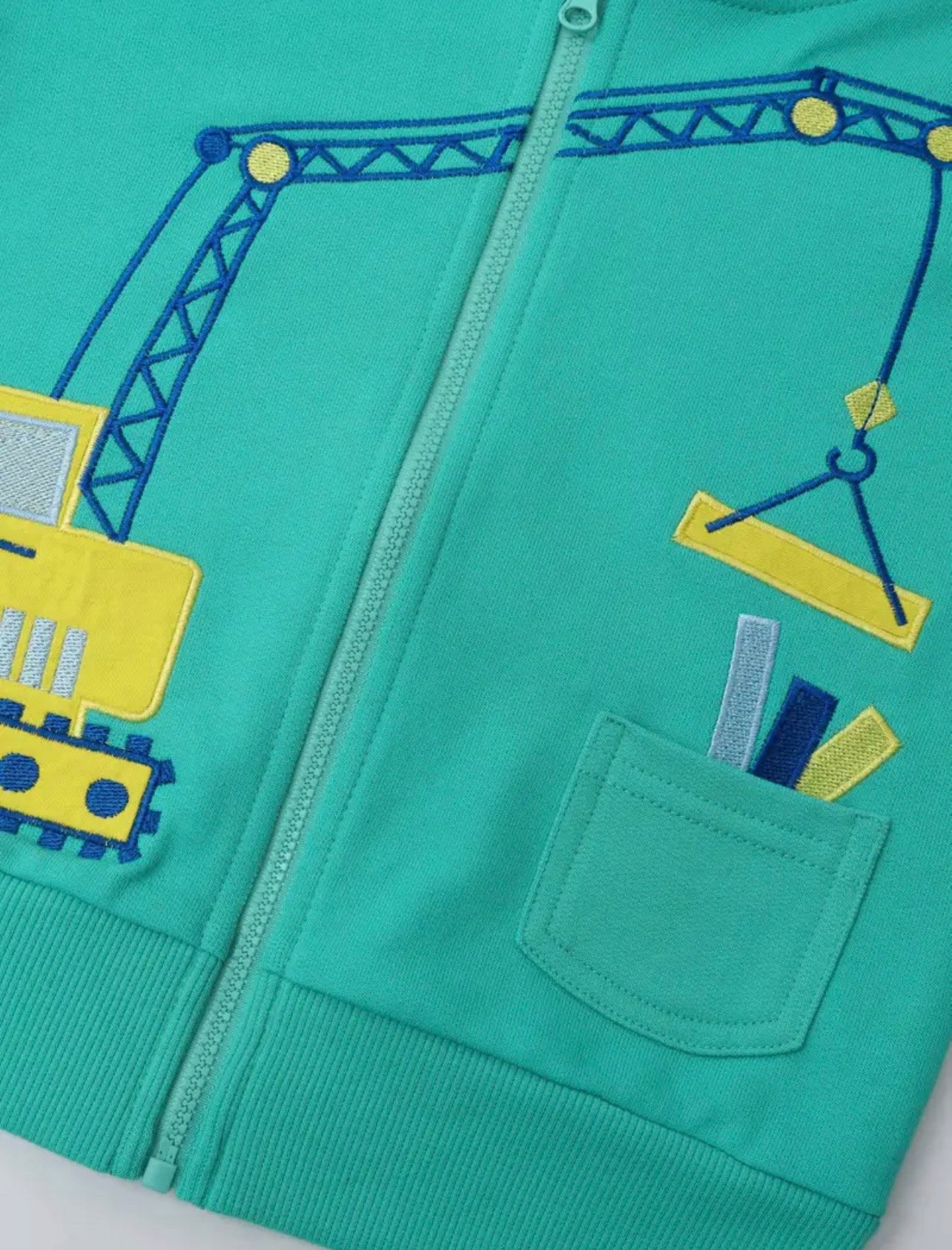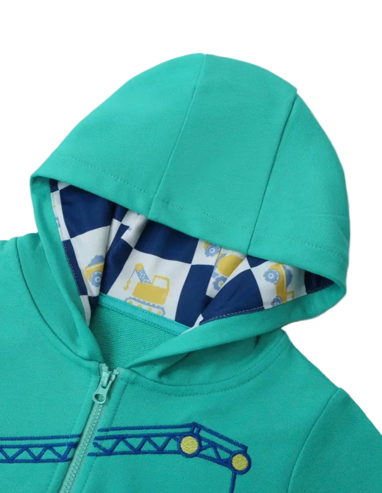 Dětská bavlněná mikina s kapucí – bagr & jeřáb (zelená)