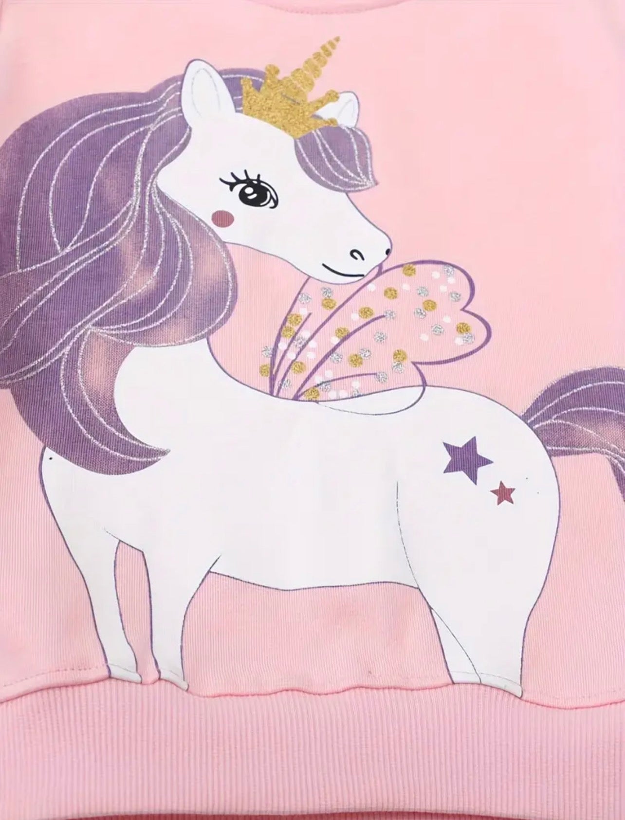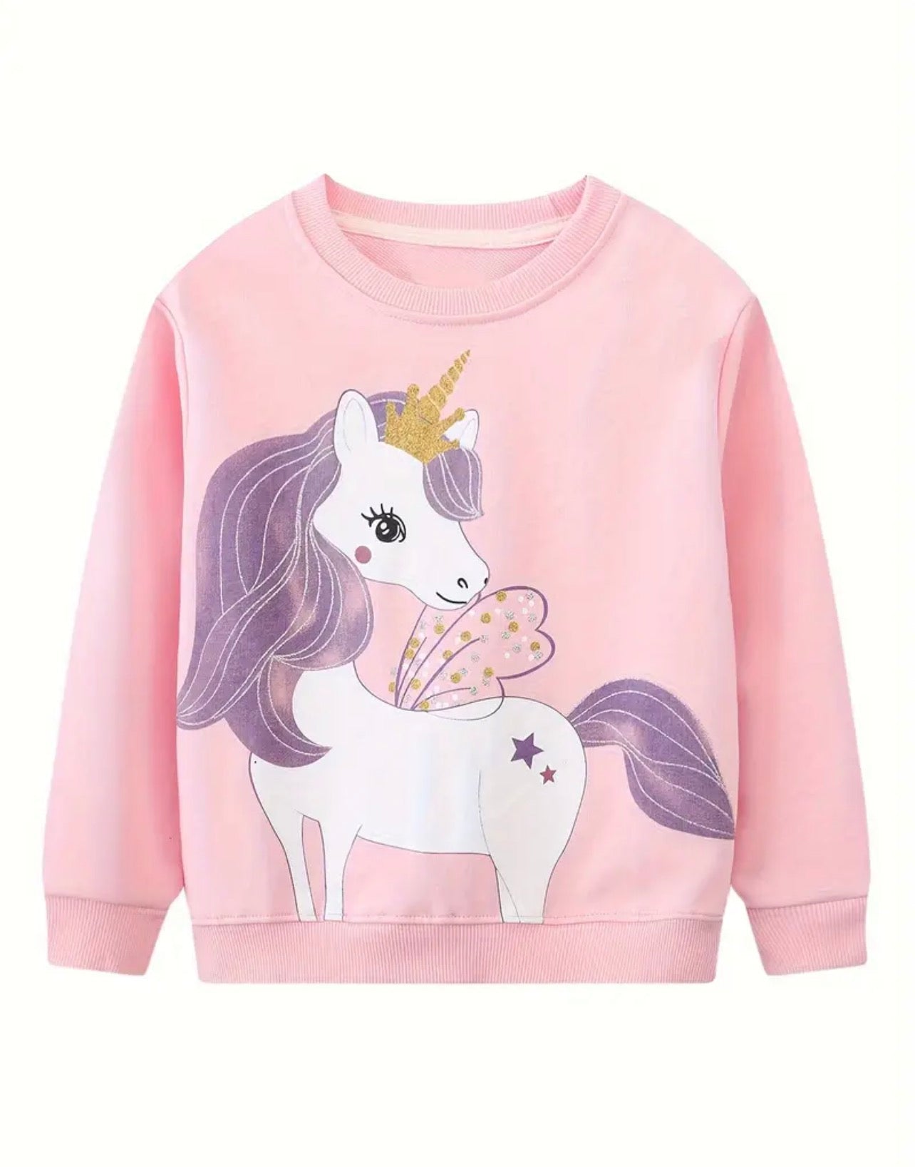 Dominantní motiv jednorožce s křídly, zlatou korunkou a jemnými třpytkami dodává mikině kouzelný vzhled. Pohodlný střih a pružné lemy na rukávech i spodním okraji zajistí komfort při každodenním nošení – do školky, školy i na volný čas.