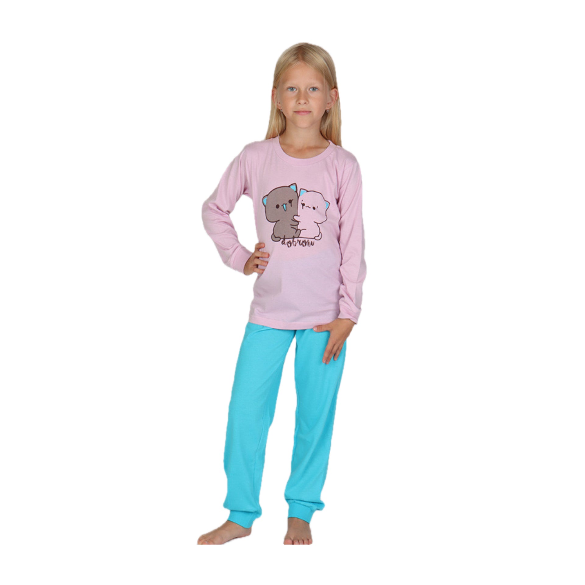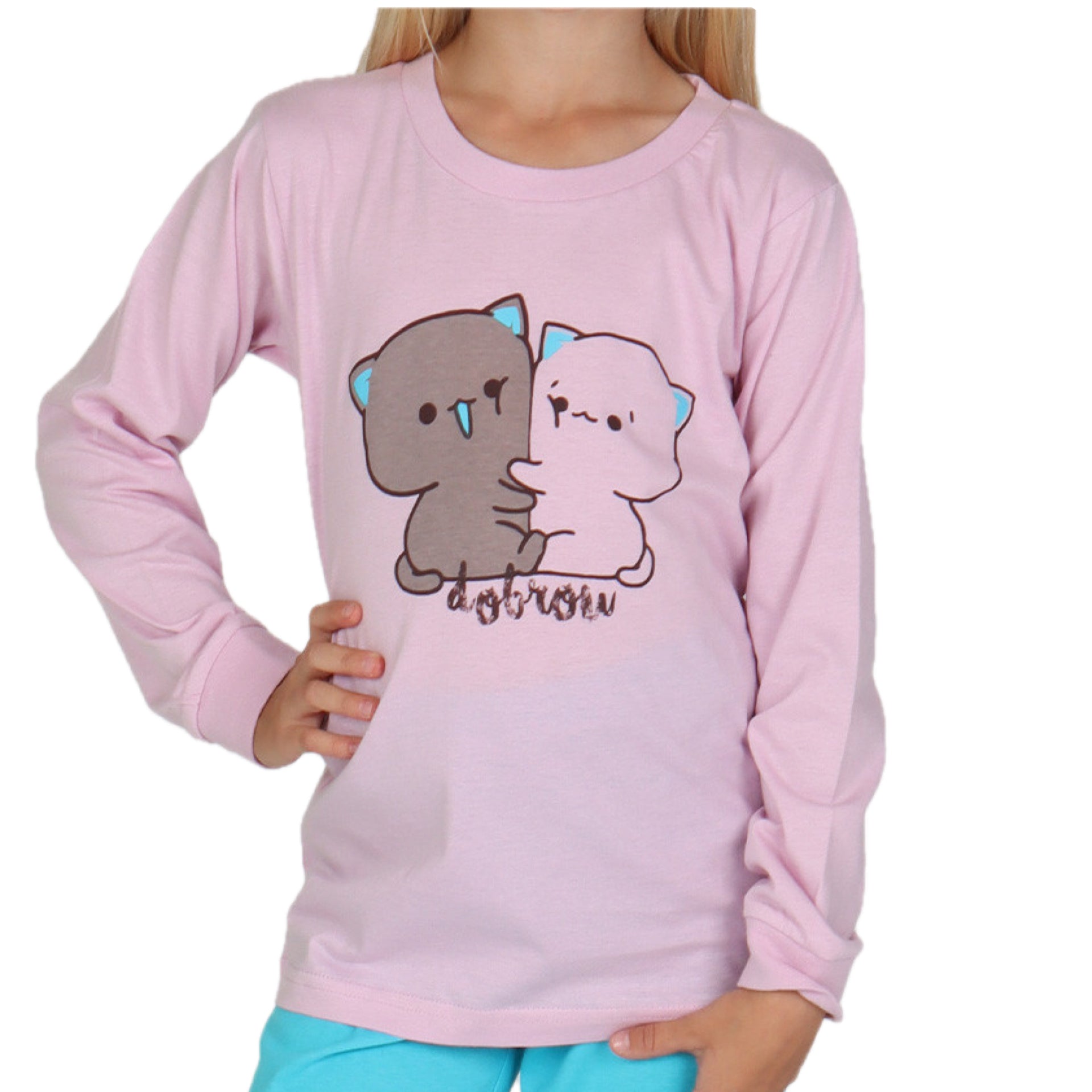 Horní díl v jemně růžové barvě zdobí dvě objímající se kočičky s nápisem dobrou, zatímco tyrkysové kalhoty dodávají celému kompletu svěží a hravý vzhled.