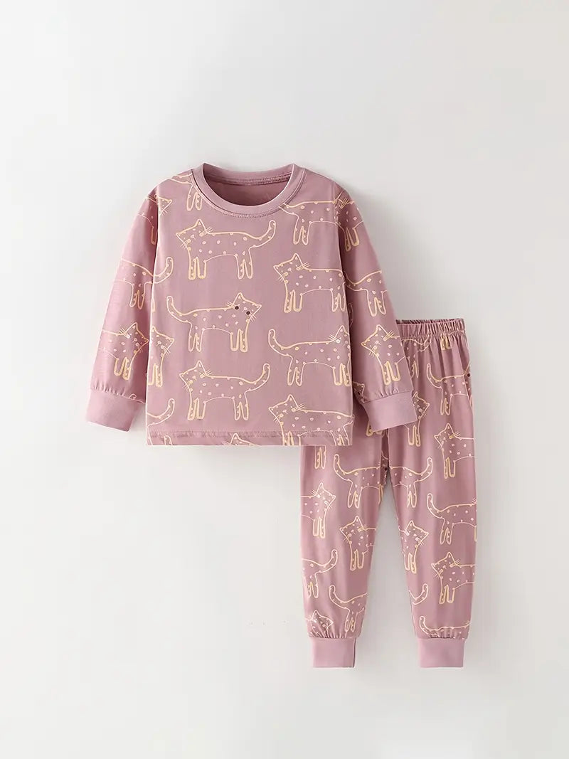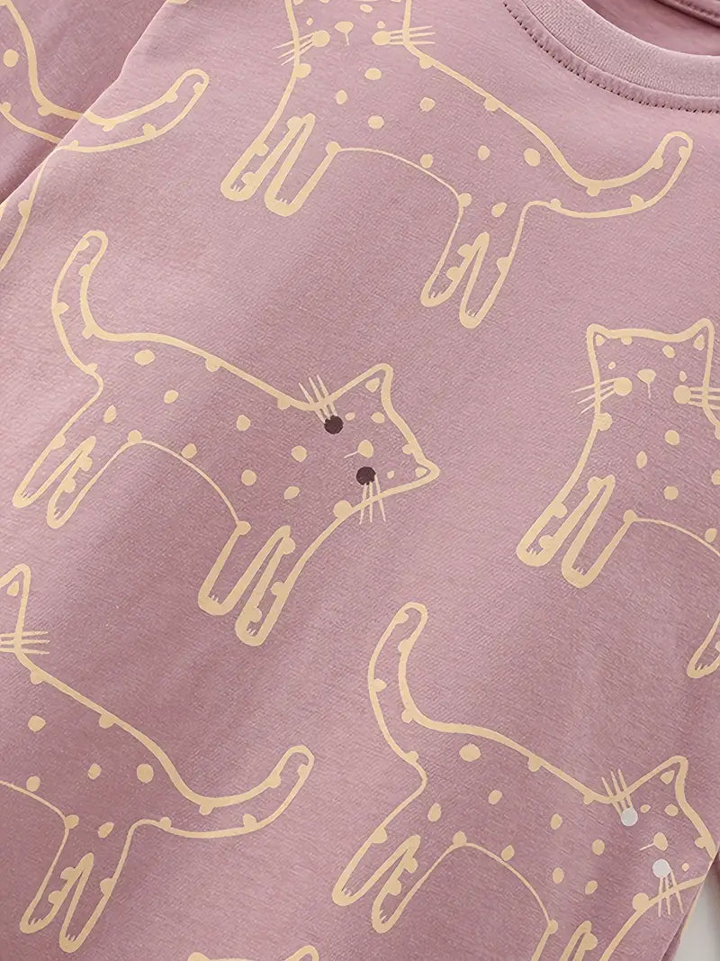 Roztomilé pyžamko pro všechny malé milovníky kočiček. Jemný fialovo-růžový základ zdobí hravý motiv koček, které se stanou těmi nejmilejšími společníky při usínání. Dlouhý rukáv a nohavice s pružnými manžetami zajistí pohodlí po celou noc.