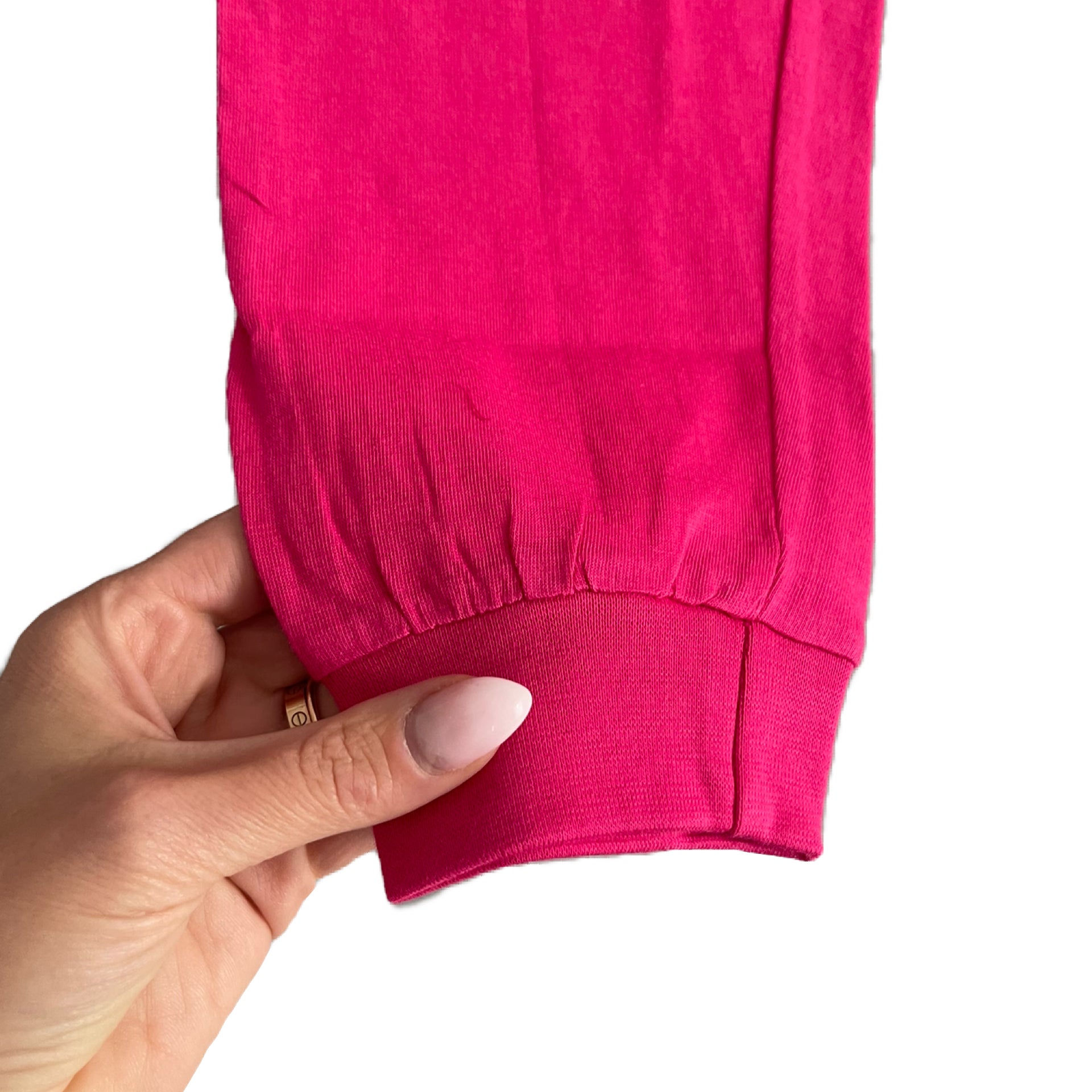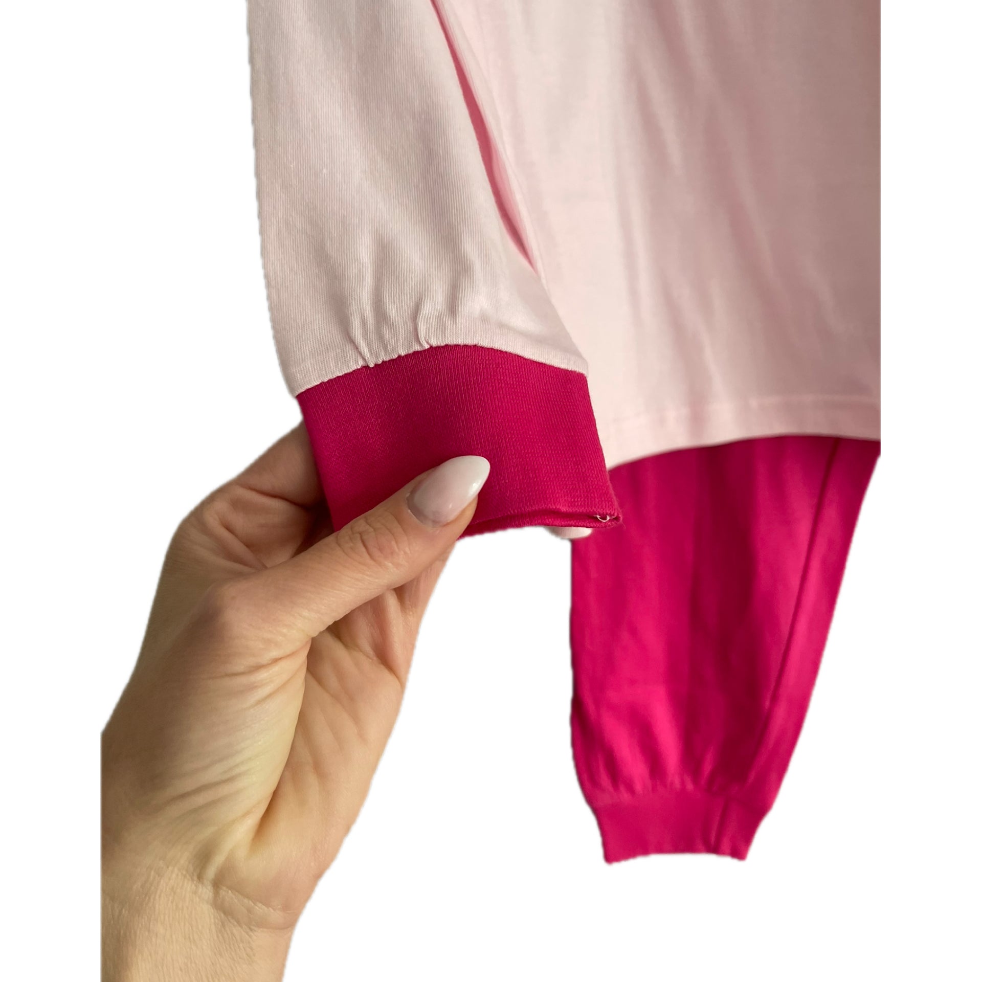 Horní díl zdobí tři roztomilí zajíčci a doplňují ho sytě růžové kalhoty s širokými náplety, které krásně drží tvar a nikde netlačí.