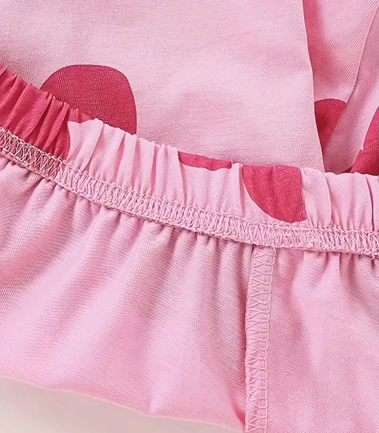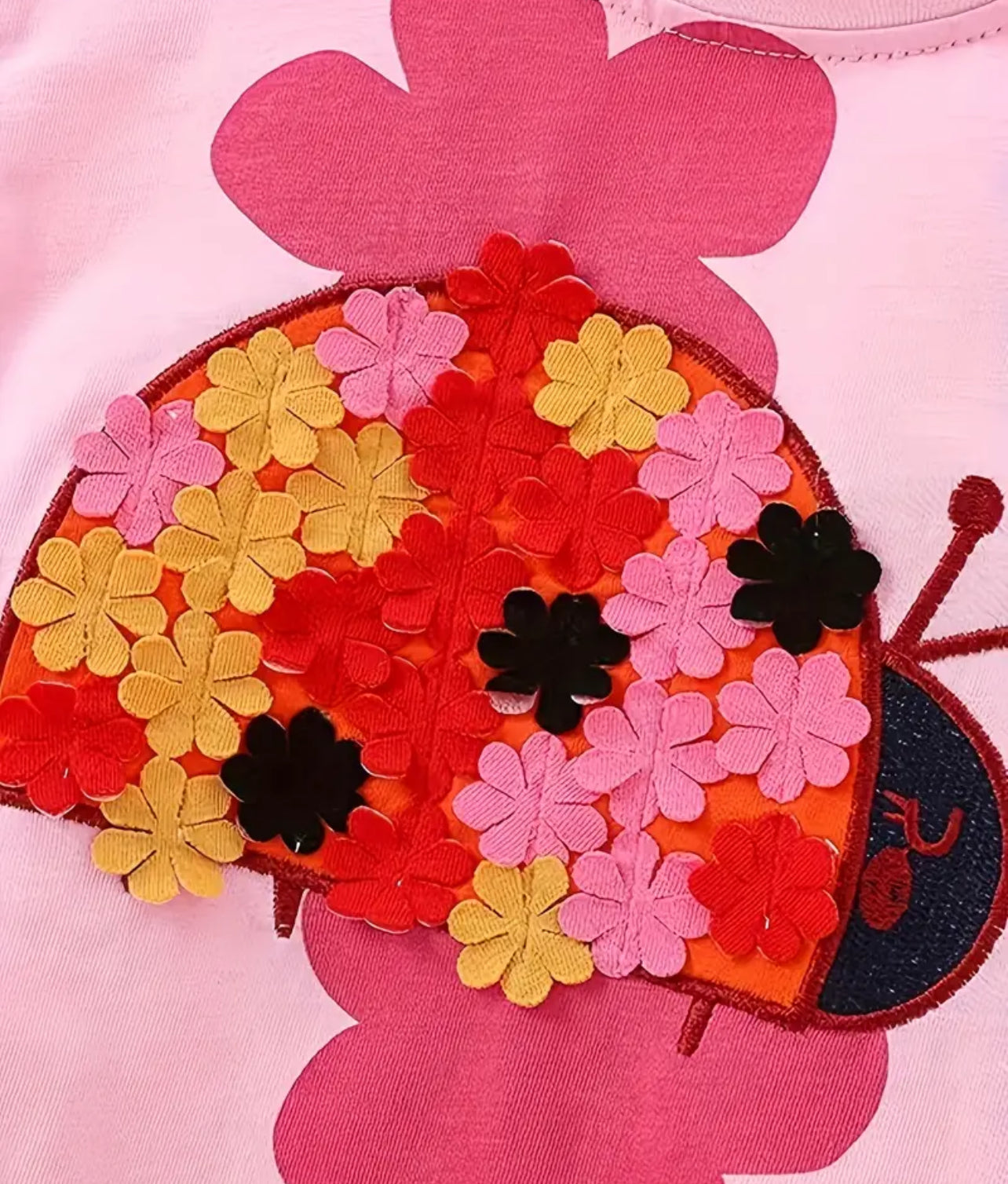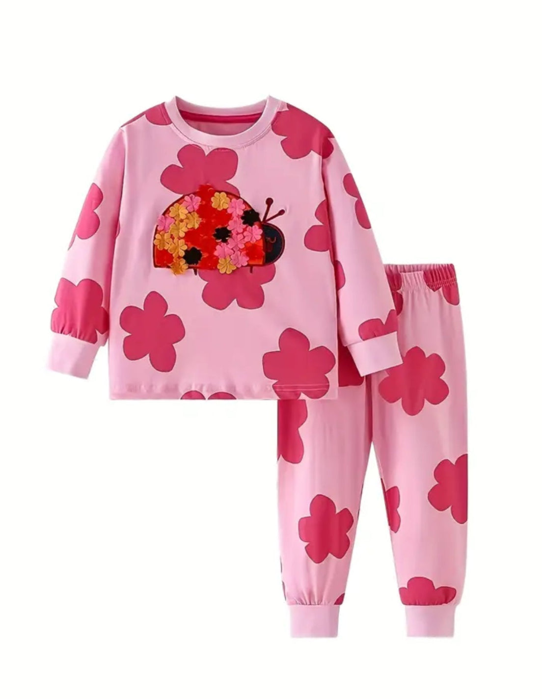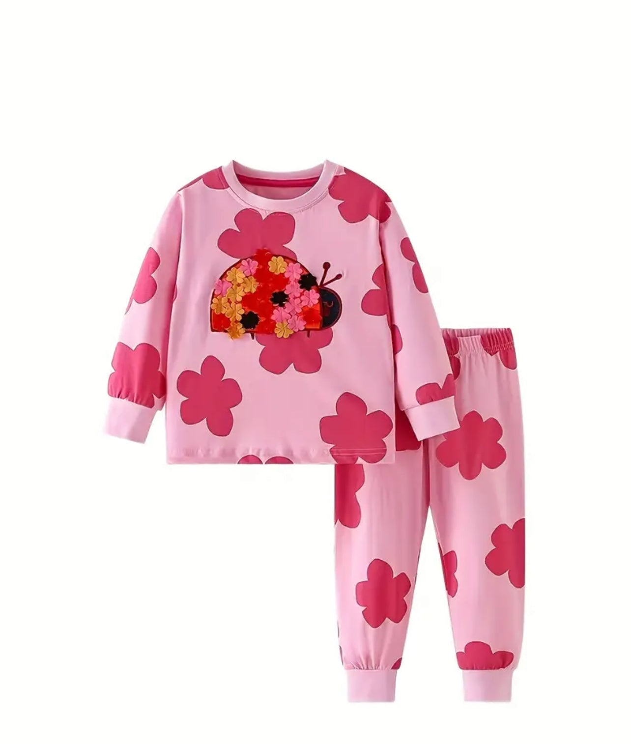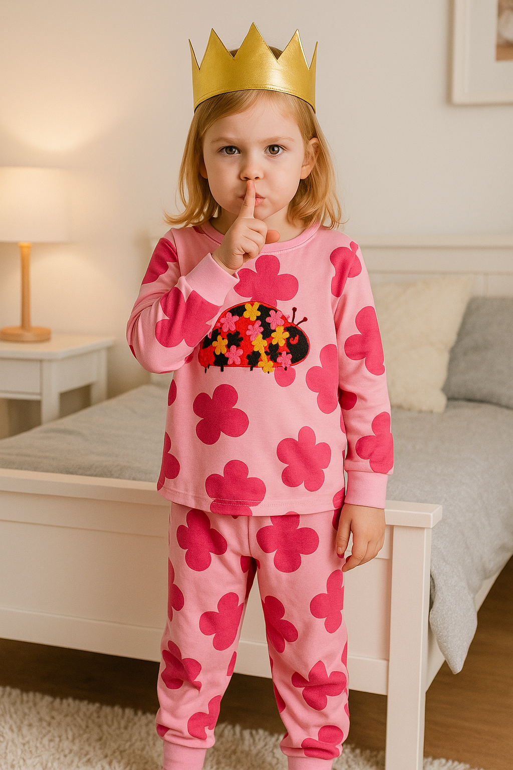 Roztomilé dvoudílné pyžamko s motivem usměvavé berušky a velkých květin potěší každou malou snílkyni. Jemný růžový podklad doplňují sytě růžové květy a barevná beruška z kvítků, která přináší štěstí rovnou do dětské postýlky.