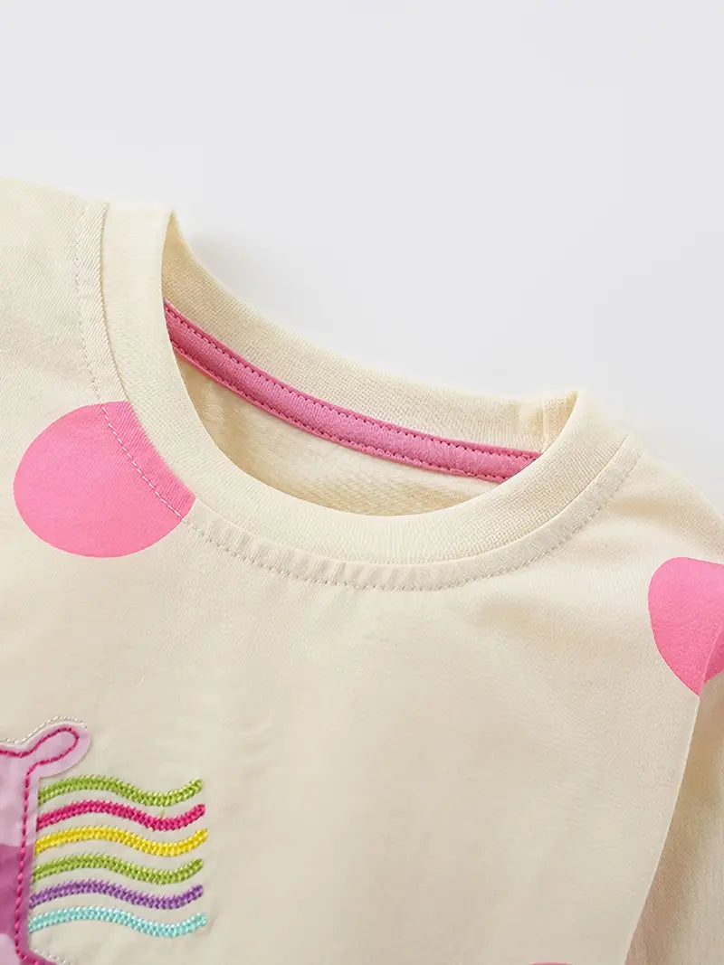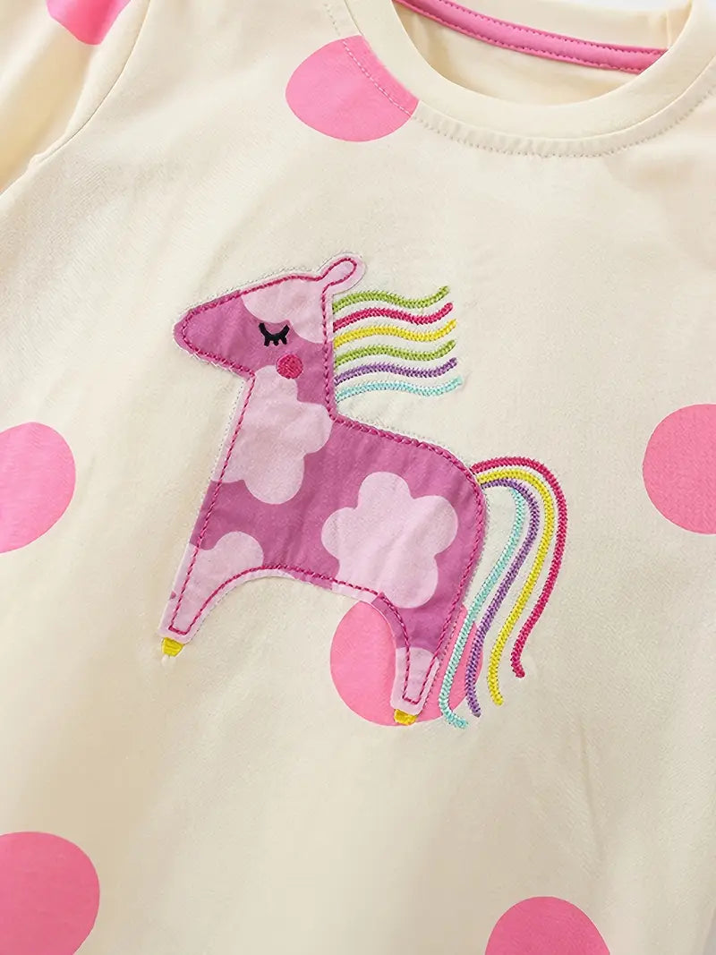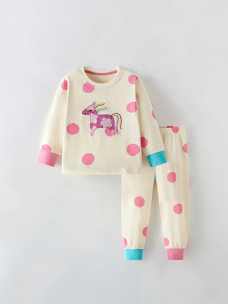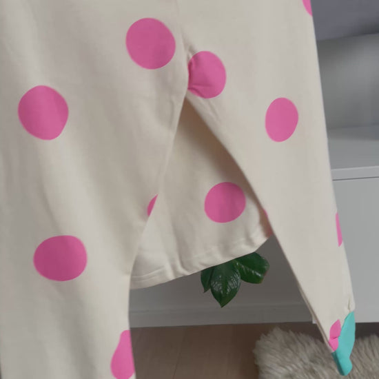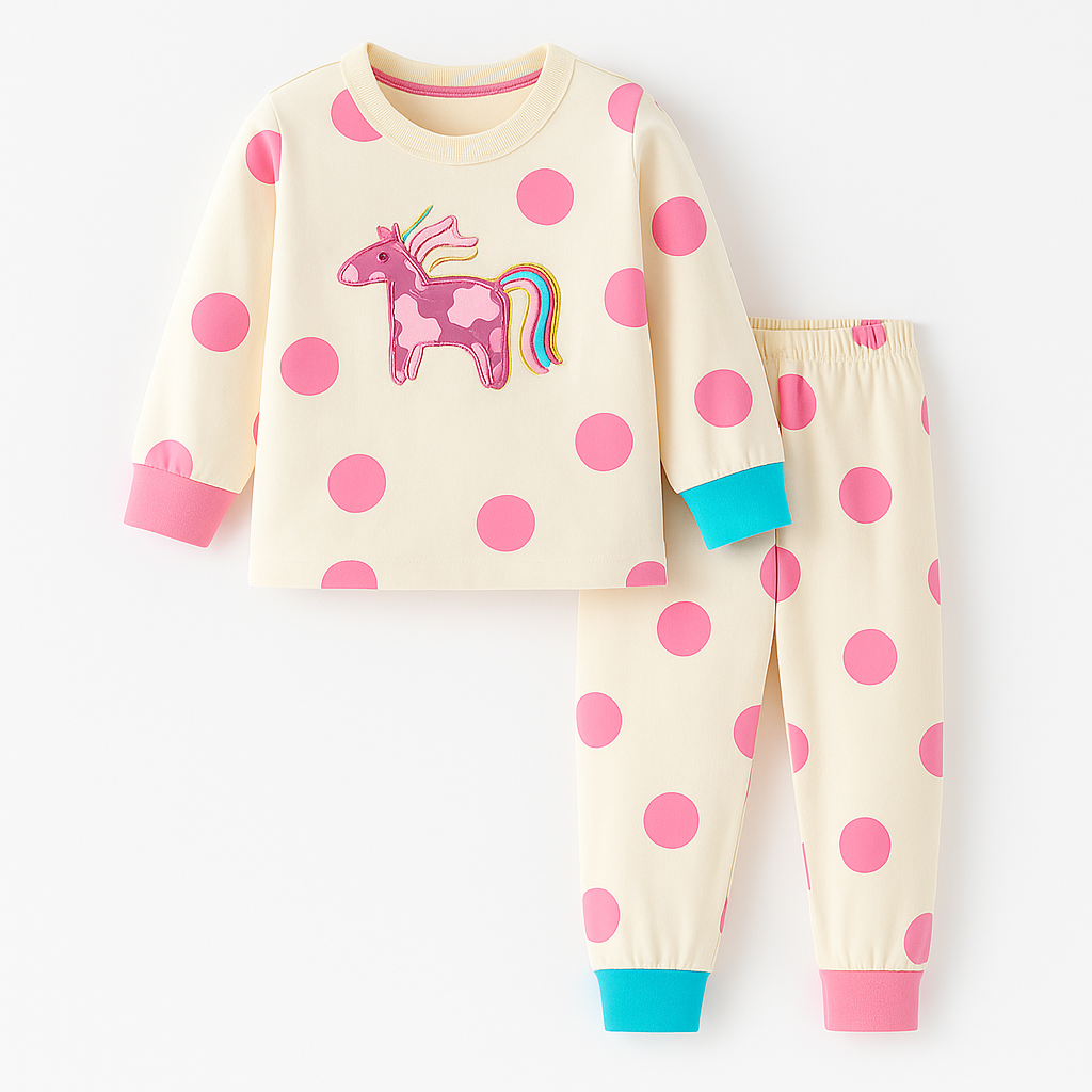 Toto roztomilé dvoudílné dětské pyžamko s dlouhým rukávem je ideální pro všechny malé princezny a snílky, kteří milují kouzla, duhu a puntíky. Krémový podklad zdobí velké růžové puntíky a veselý jednorožec s duhovou hřívou, který vykouzlí úsměv i při večerním oblékání.