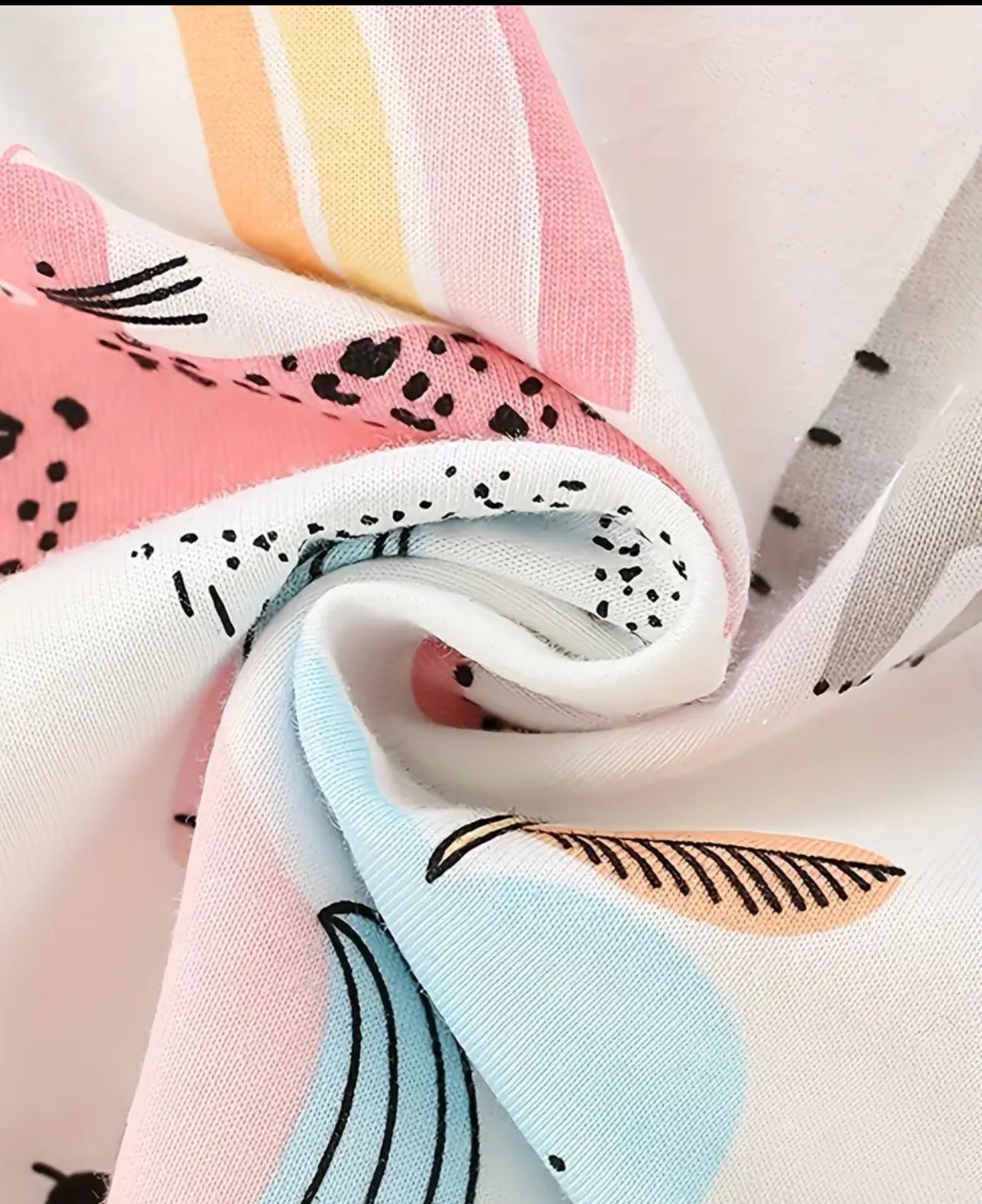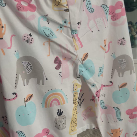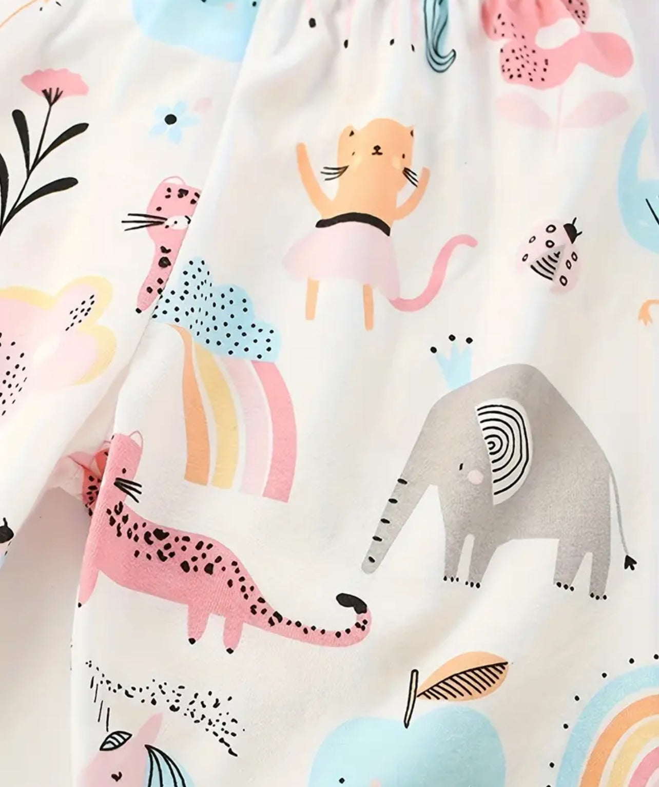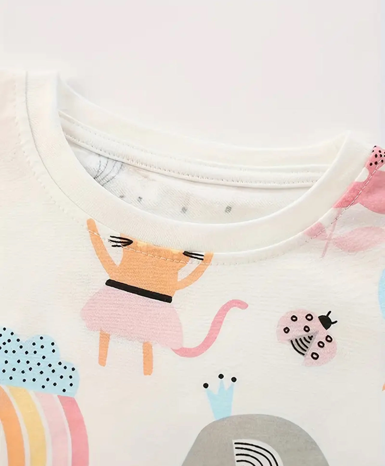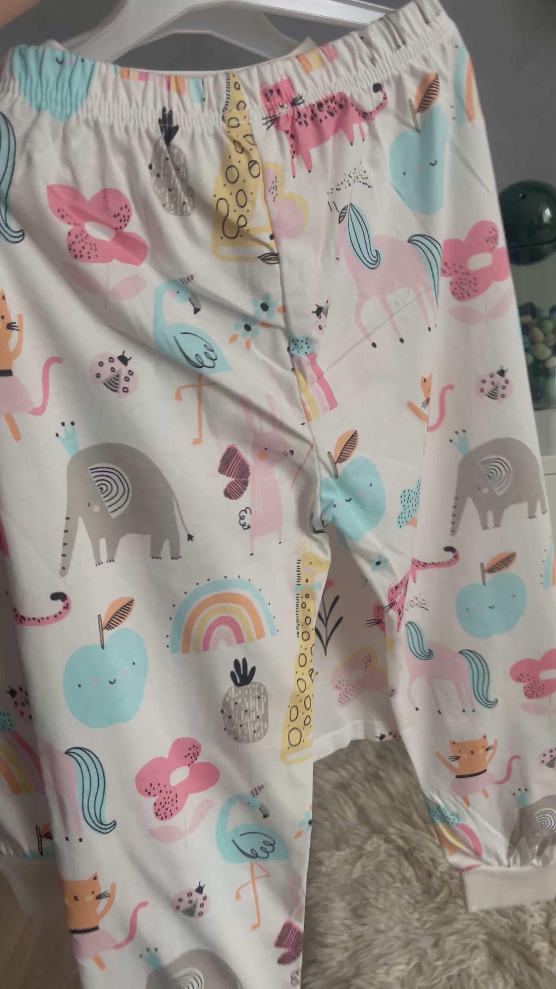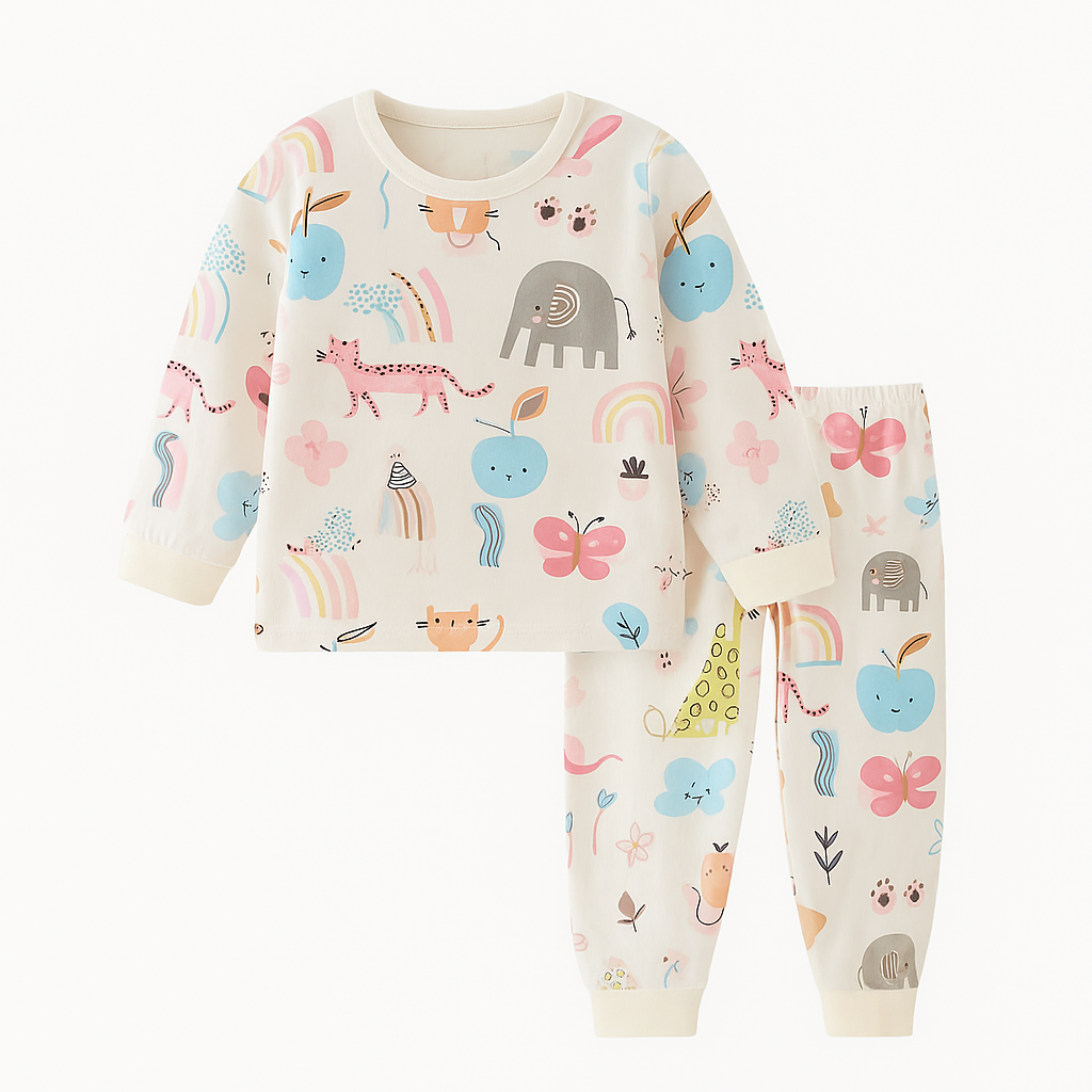 Svět plný radosti a pohádkových snů! 🤍 Toto kouzelné pyžamko s dlouhým rukávem je poseté barevnými motivy – usměvavými jablíčky, duhou, motýlky i sloníky – které vykouzlí úsměv každému malému snílkovi před spaním.