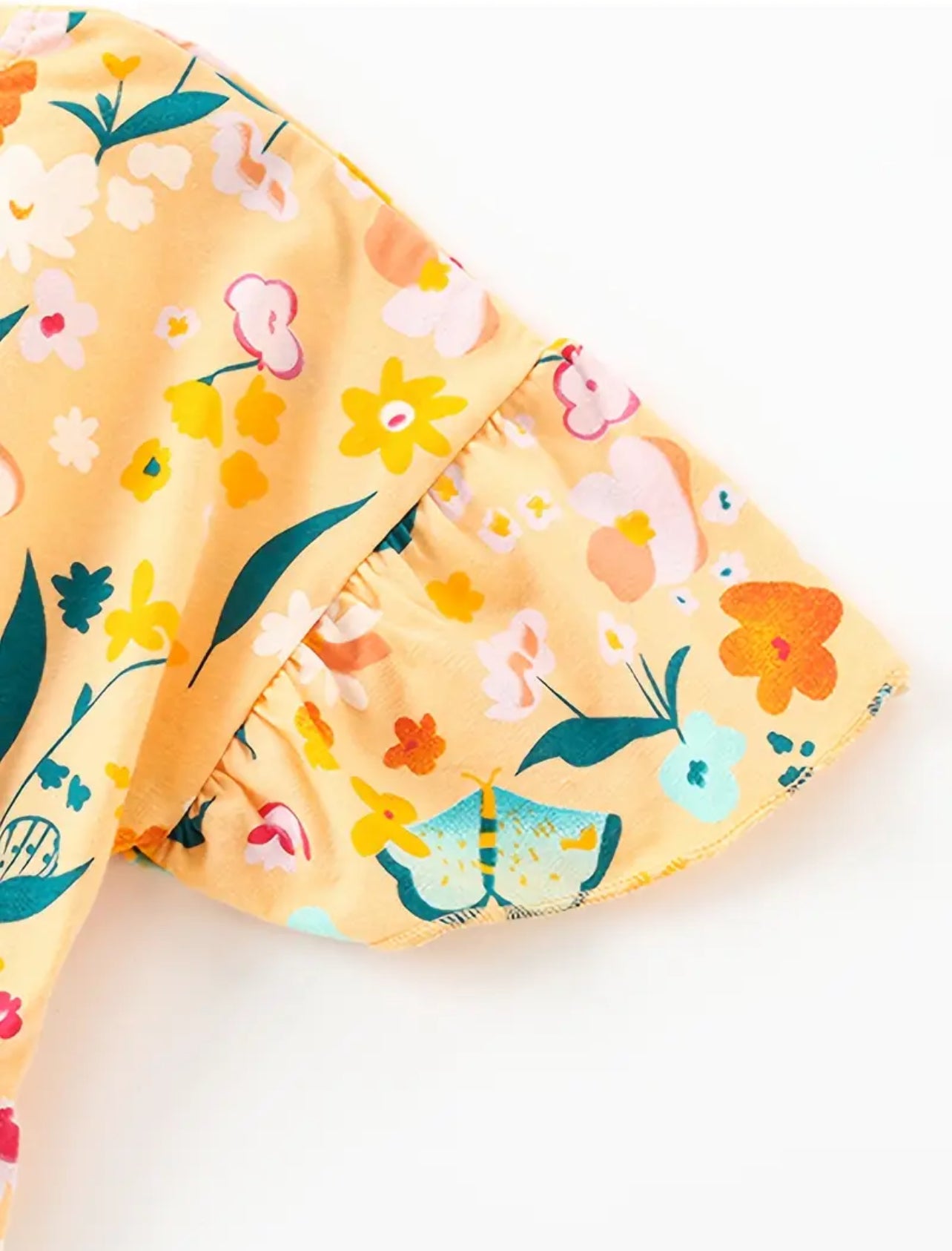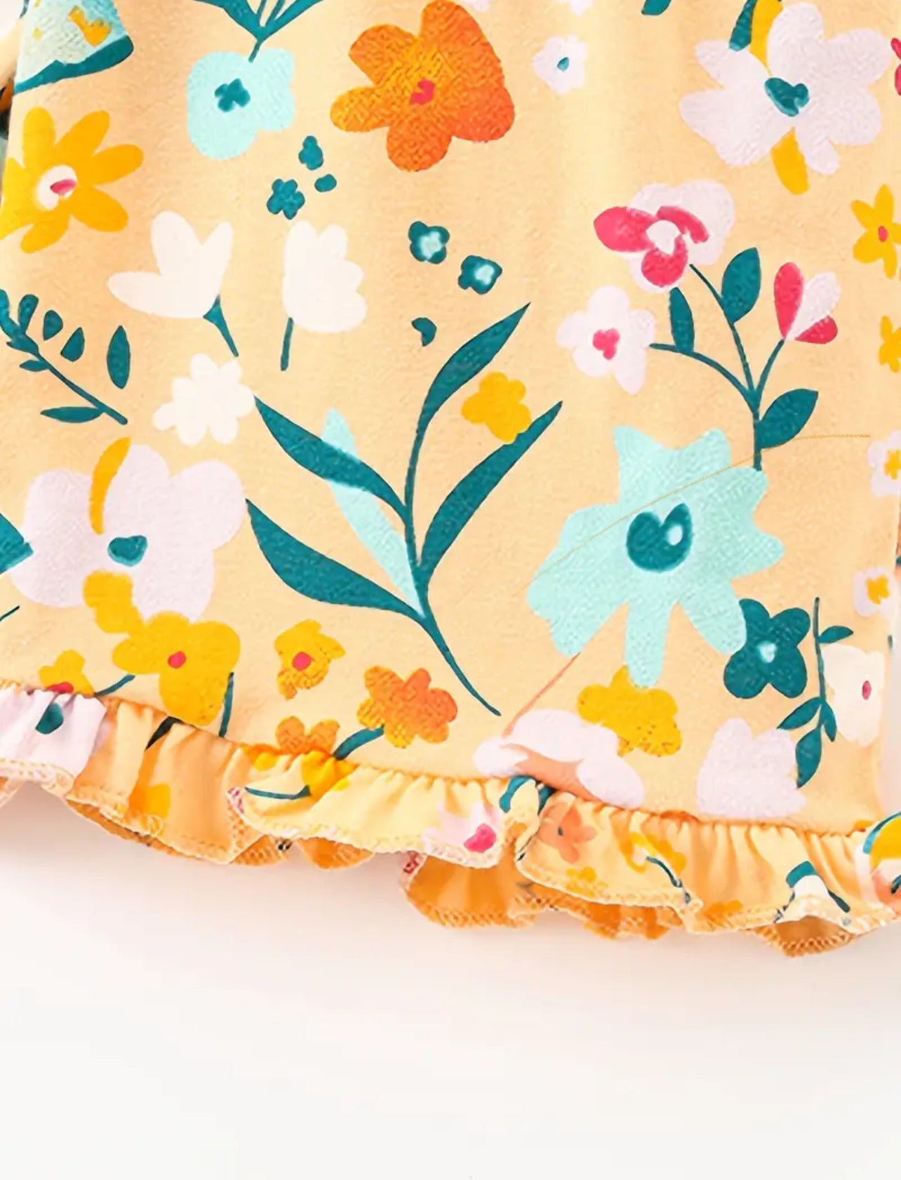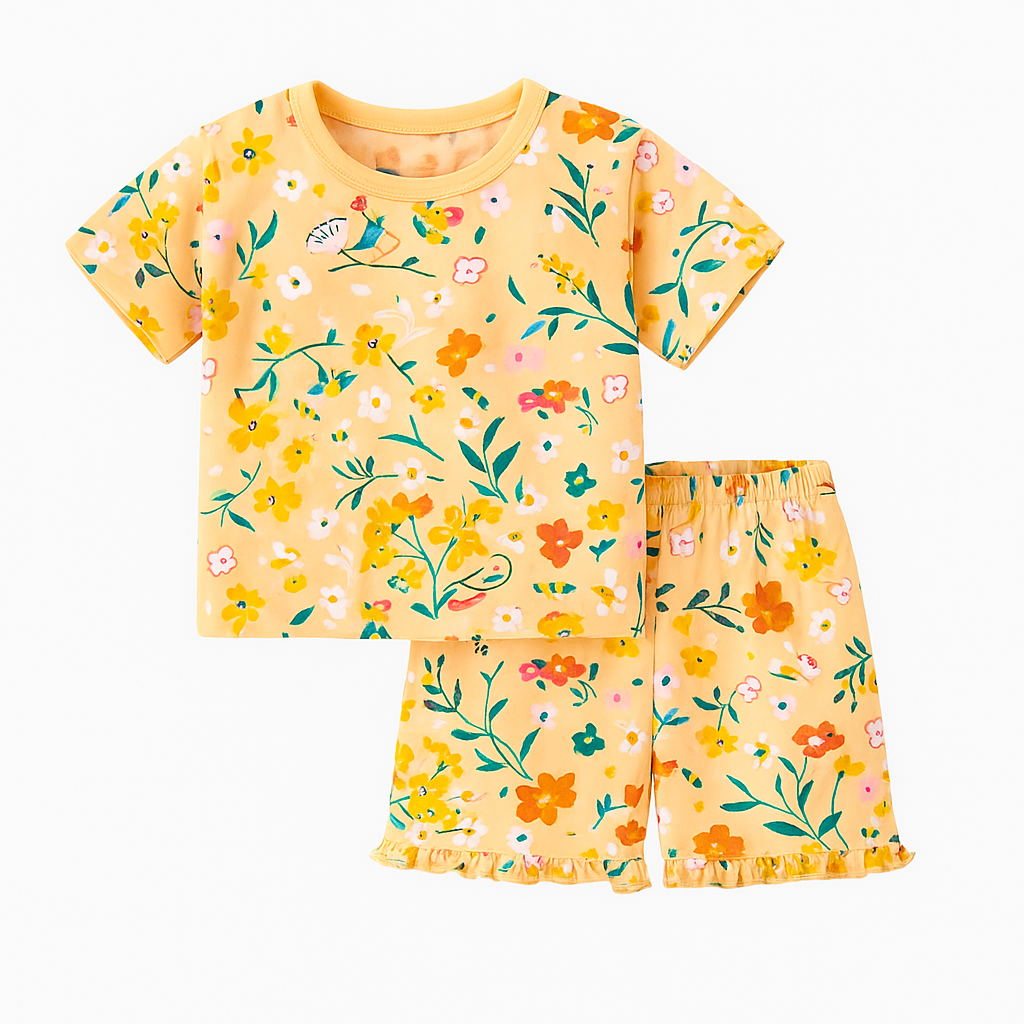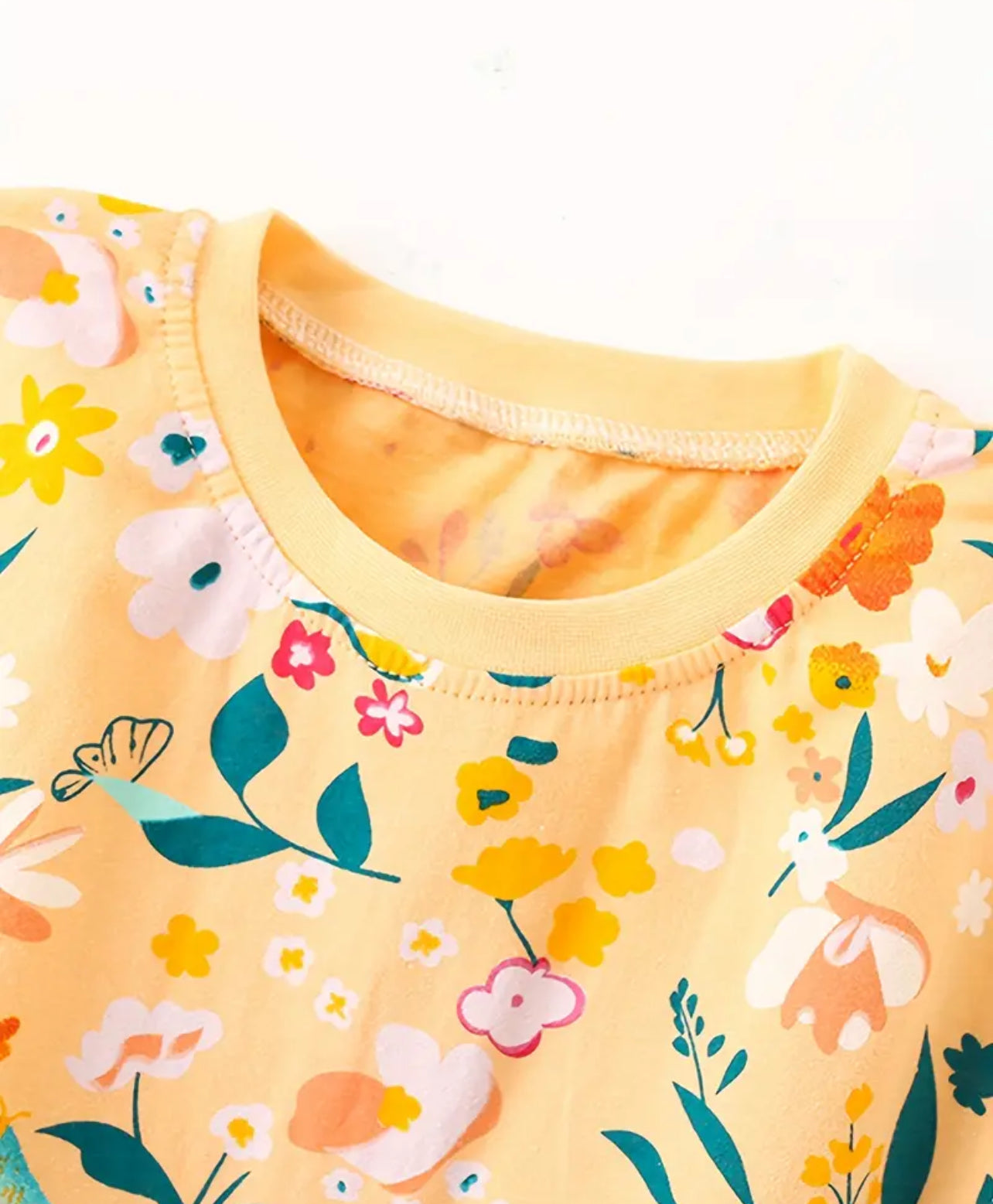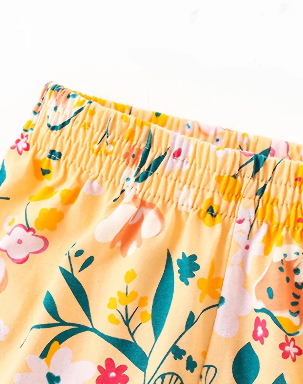 Komplet tvoří tričko s krátkým rukávem a šortky s jemnými volánky, oba díly zdobené veselým květinovým potiskem a drobnými ptáčky.