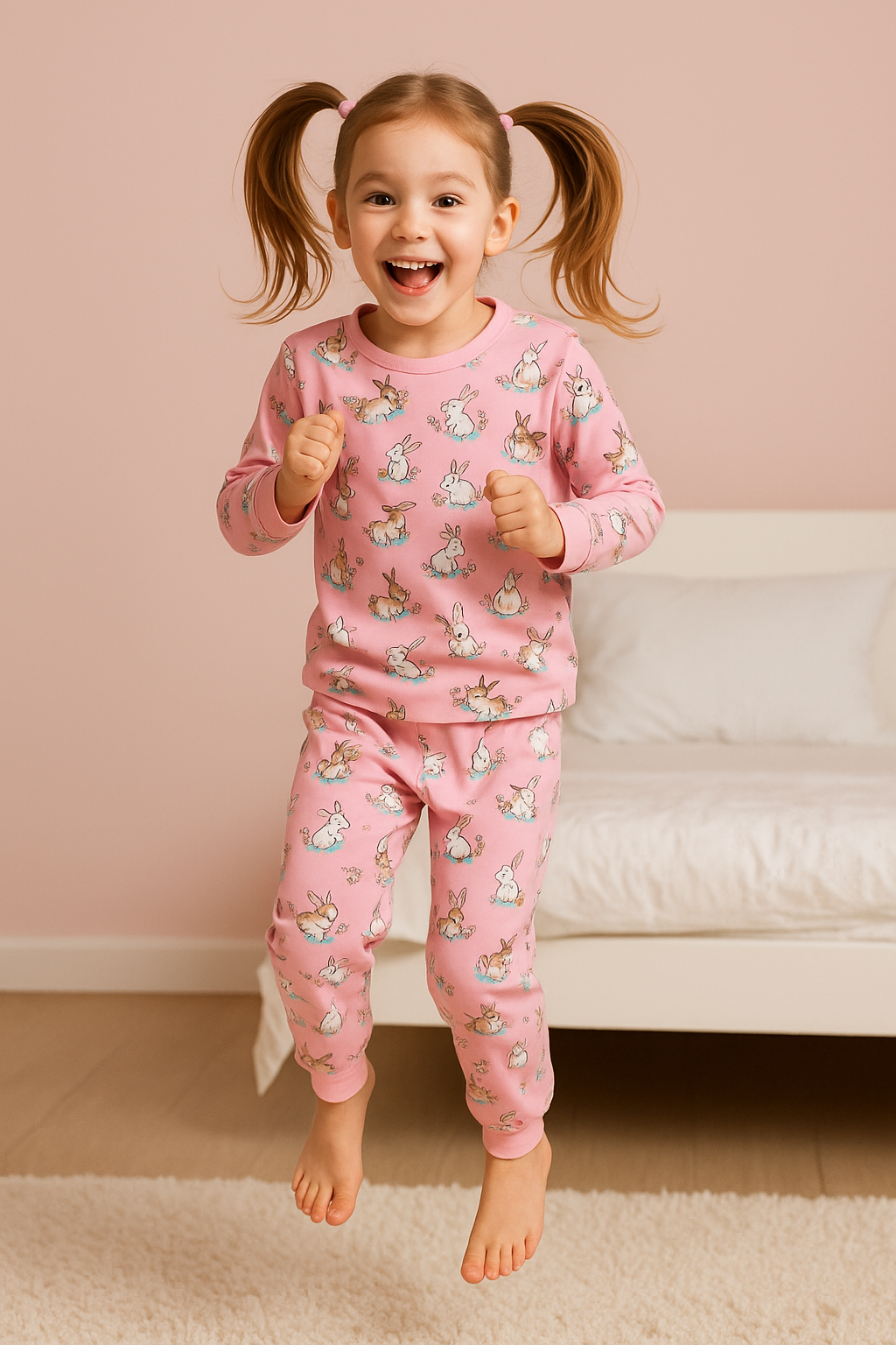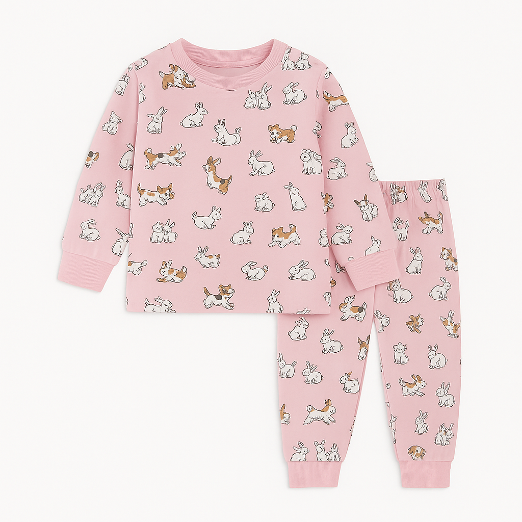 Roztomilé pyžamko v něžně růžové barvě, poseté veselými králíčky, kteří dětem přinesou ty nejkrásnější sny. ✨