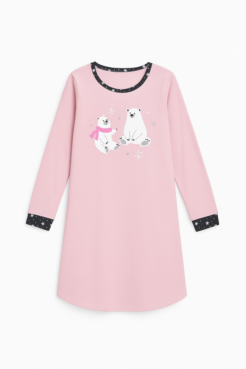 Přední stranu zdobí roztomilí lední medvídci, kteří dohlížejí na klidný spánek. Dlouhé rukávy a kontrastní lemy s motivem hvězdiček dodávají košilce kouzelný vzhled i pohodlí.