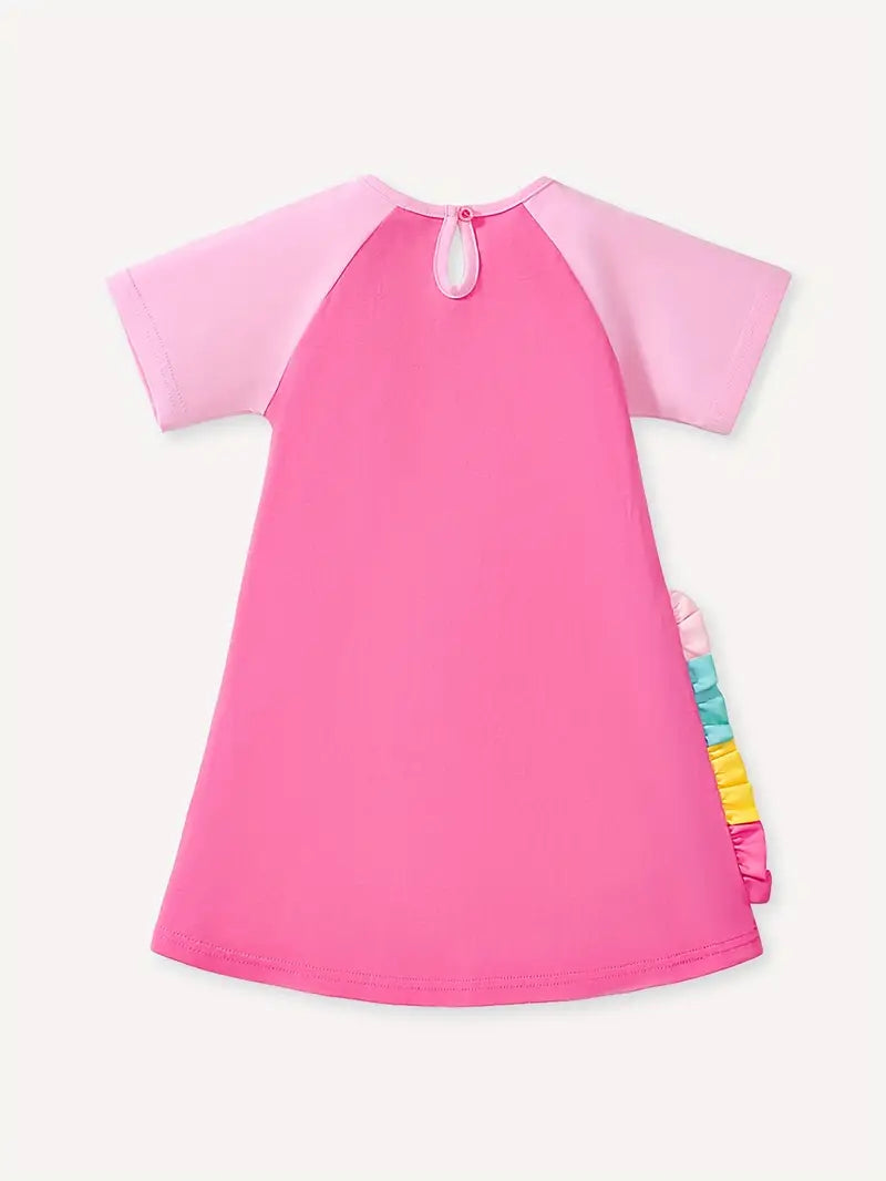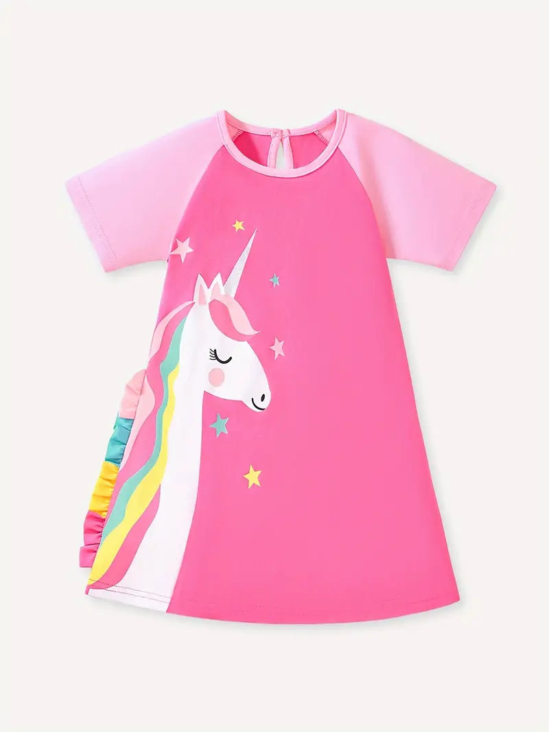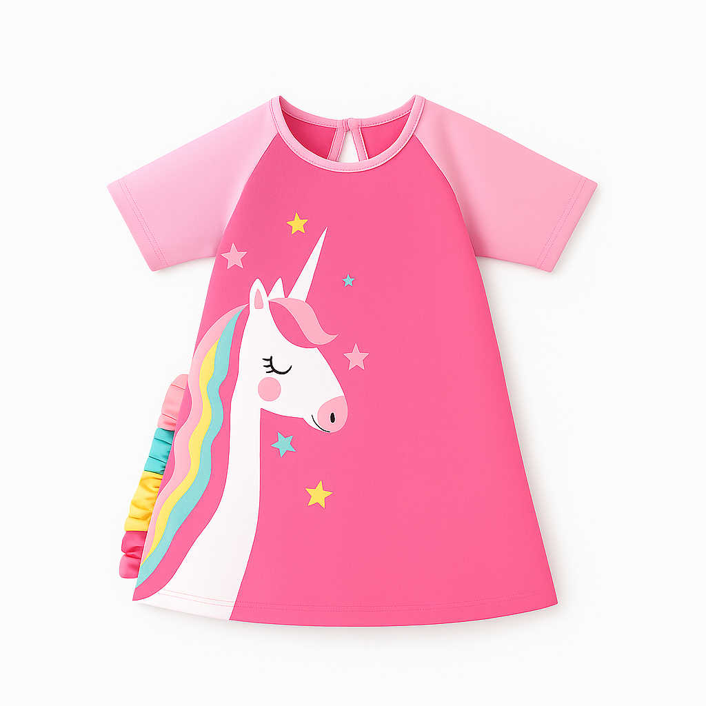 Roztomilá růžová noční košilka s krátkým rukávem potěší každou malou princeznu, která miluje kouzelné sny. Na přední straně zdobí košilku krásný jednorožec s barevnou duhovou hřívou a hvězdičkami, které navodí tu správnou pohádkovou atmosféru. 🌈⭐