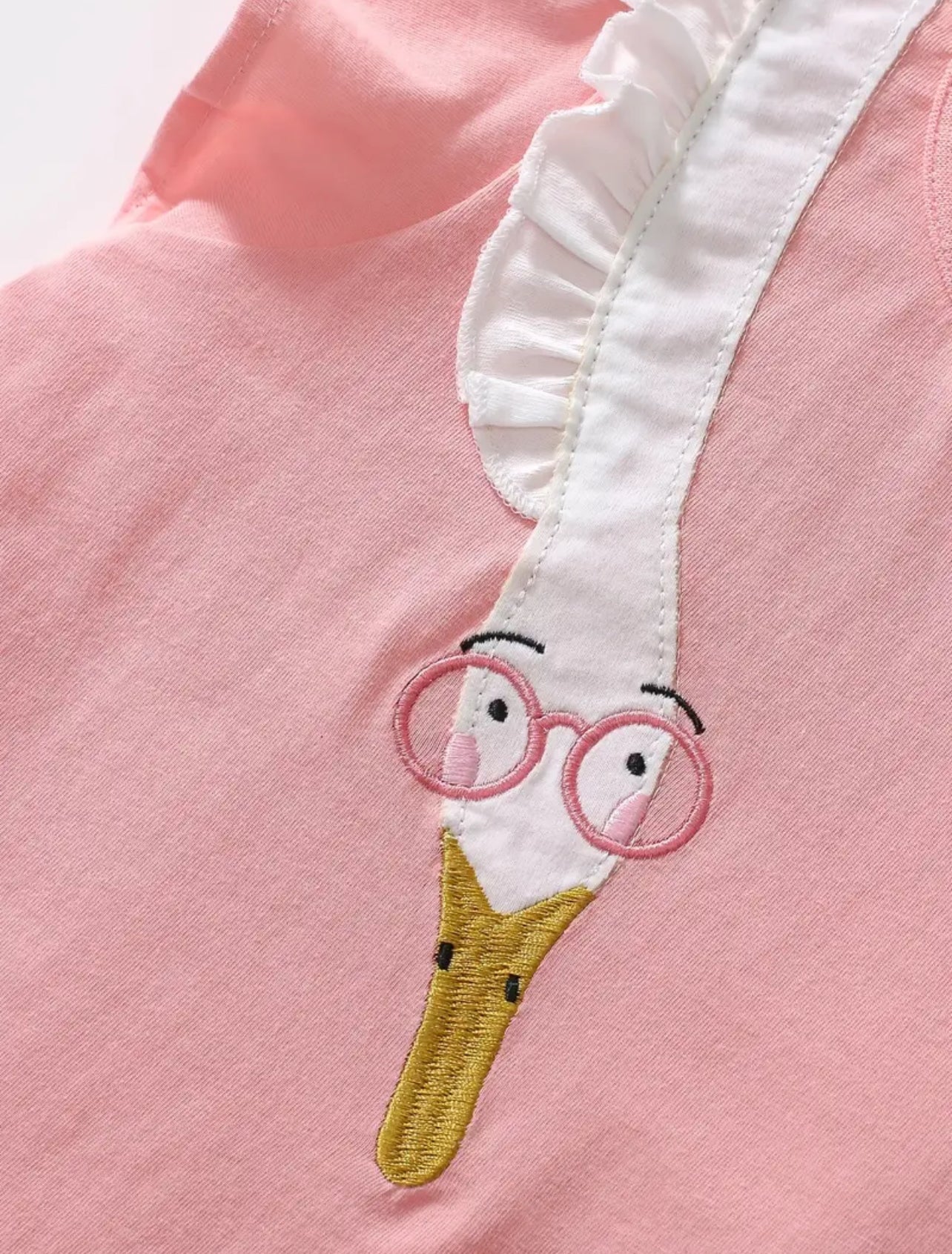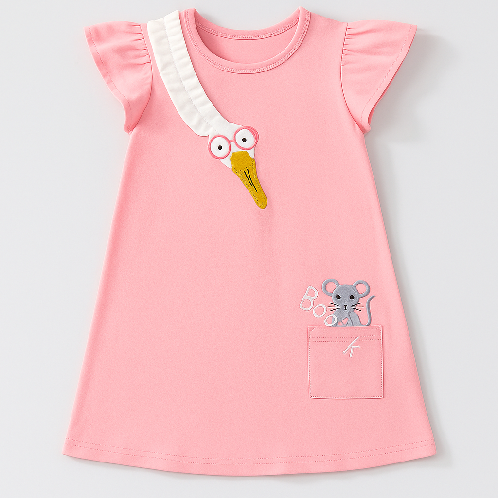 Tato něžná růžová noční košilka z měkké 100% bavlny je jako stvořená pro malé čtenářky, snílkyně a milovnice zvířátek. Originální aplikace labutě s brýlemi, která se vine přes rameno, a malá myška vykukující z kapsy dodávají košilce kouzlo i hravost. Lehký materiál, pohodlný střih a roztomilé rukávky zajistí klidný a veselý spánek.