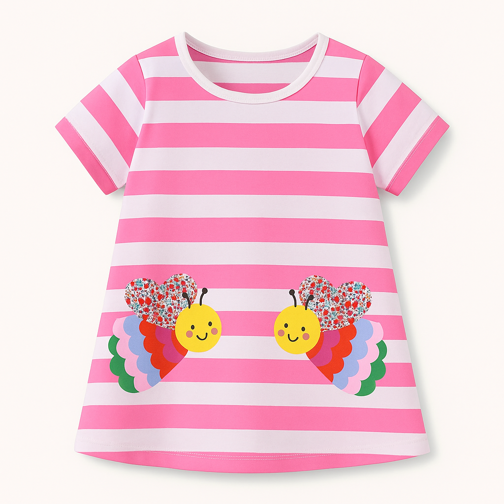Tato rozkošná dívčí noční košilka s krátkým rukávem je ideální pro malé snílkyně, které milují přírodu, květinky a včelky. Díky 100% bavlně je heboučká, vzdušná a příjemná na nošení. A ty dvě včelky s barevnými křidélky? Ty hlídají, aby byl každý spánek klidný a radostný 🍯