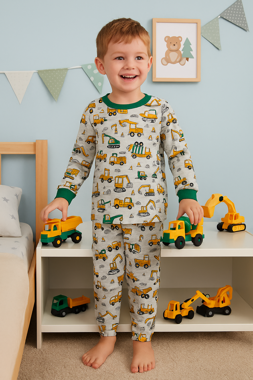 🌙 Ideální pyžamko pro malé stavitele, kteří si i ve snu rádi hrají na stavbě.