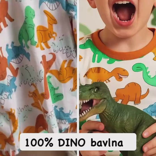 Barevné dětské pyžamko s motivem veselých dinosaurů. Vyrobené z jemné a prodyšné 100% bavlny, šetrné k dětské pokožce. Pohodlný střih ideální na spaní i domácí pohodu.