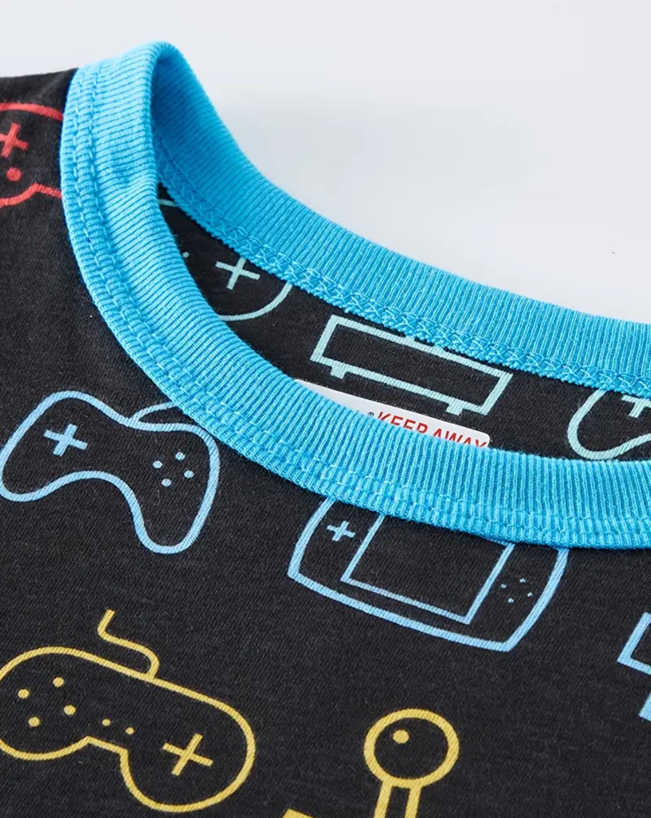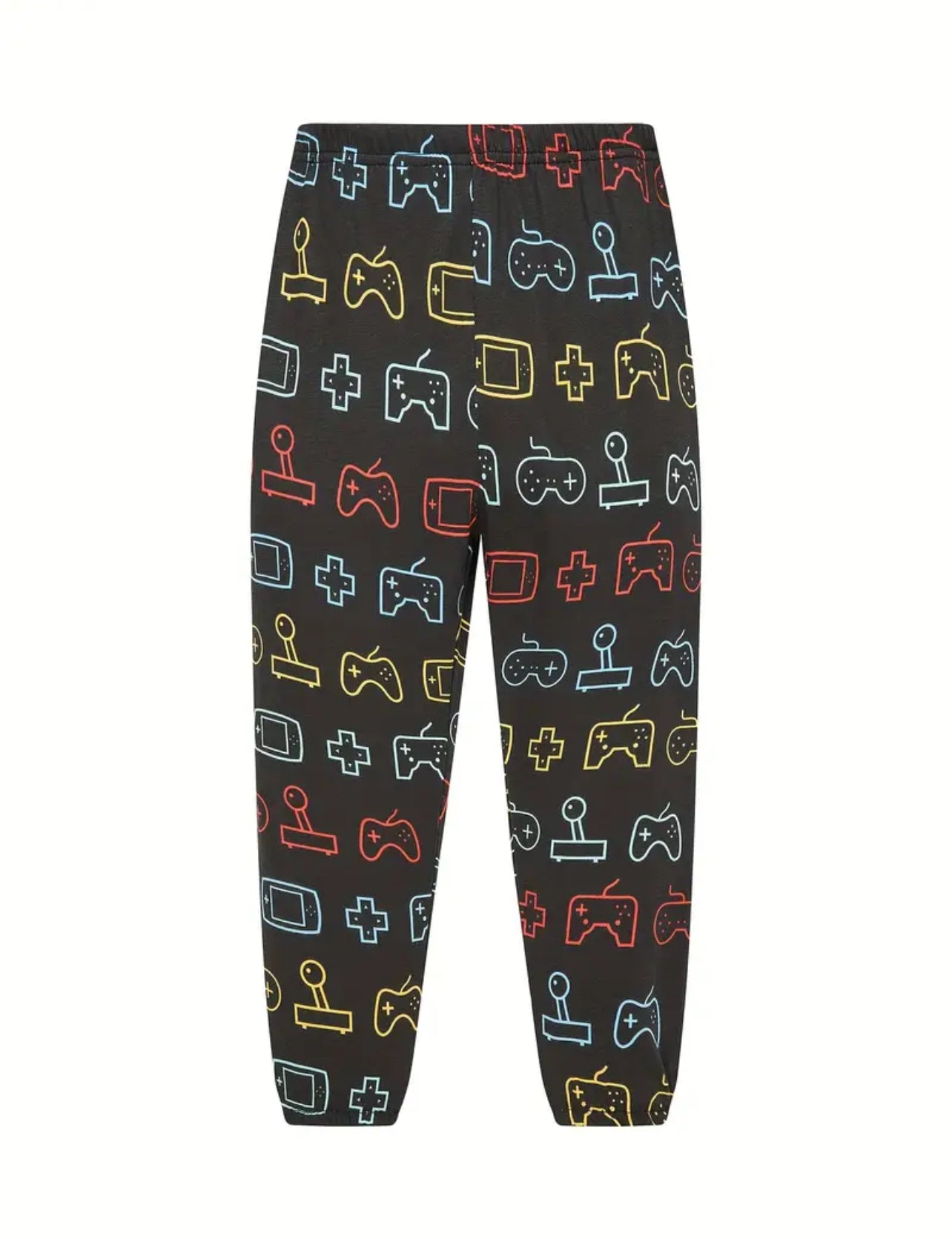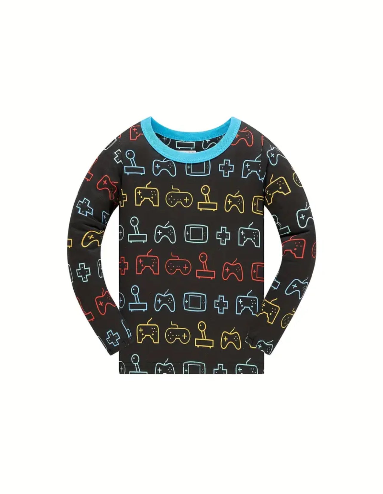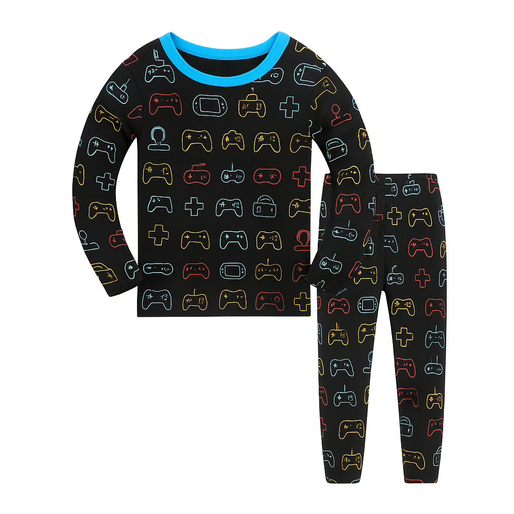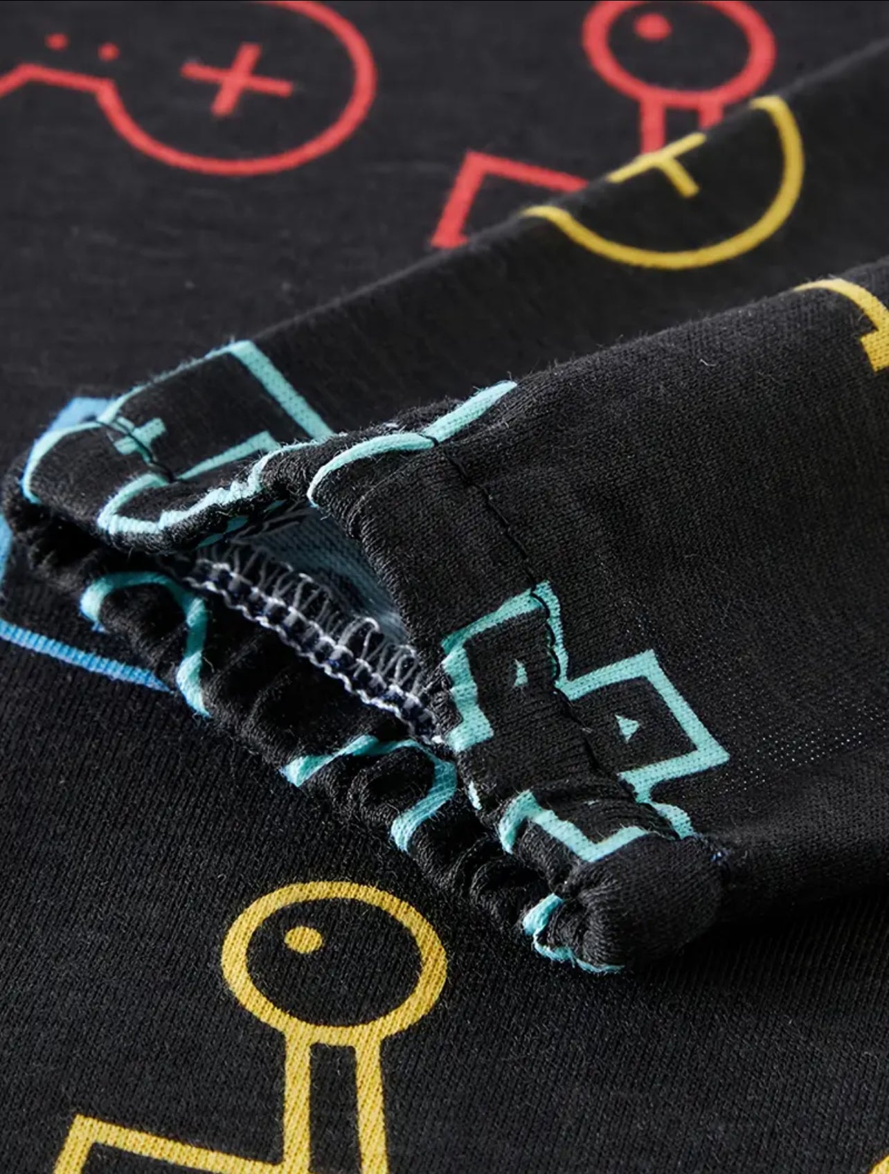 Toto dvoudílné chlapecké pyžamko je ideální pro všechny malé fanoušky konzolí, ovladačů a nočního dobrodružství ve světě videoher. Černý podklad s barevnými herními motivy (gamepady, joystick, pluska a tlačítka) přenese každého snílka rovnou do říše digitálních snů.