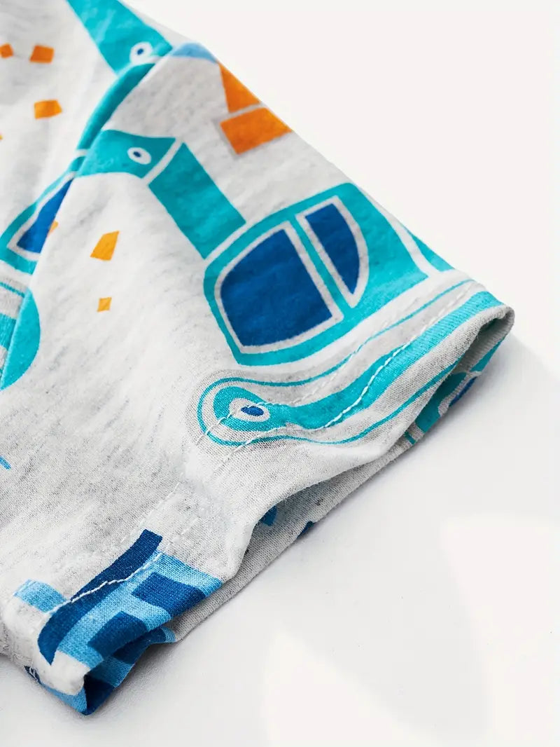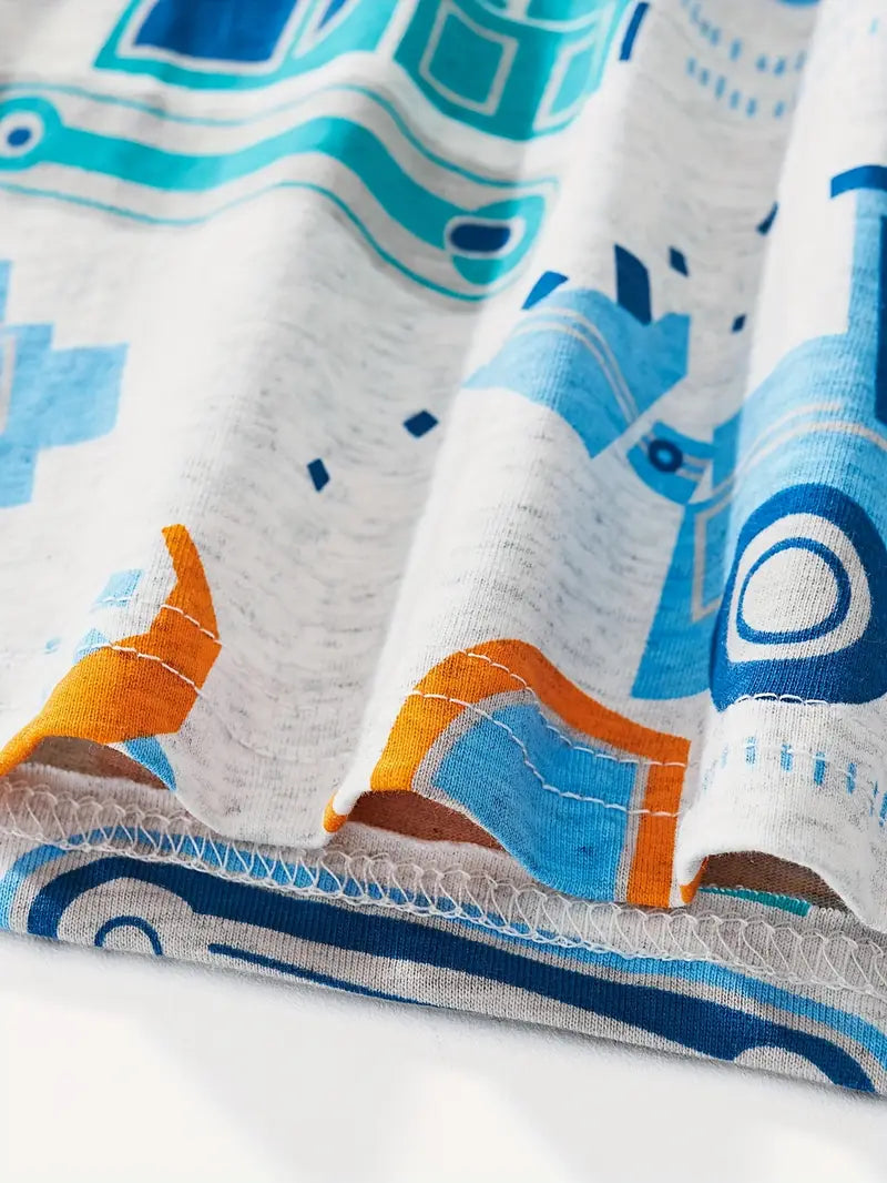Pohodlné dvoudílné pyžamko s krátkým rukávem a kraťasy je jako dělané pro kluky, kteří milují bagry, buldozery, náklaďáky a traktory. Barevný potisk v tónech modré, tyrkysové a oranžové zaručí, že ani při usínání nebude o zábavu nouze.