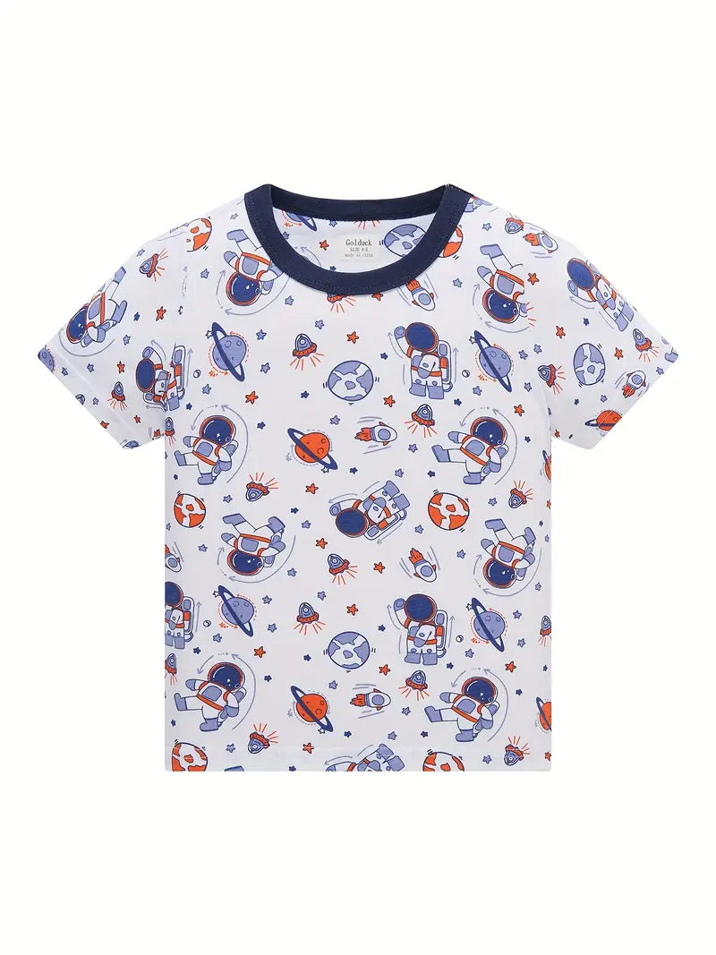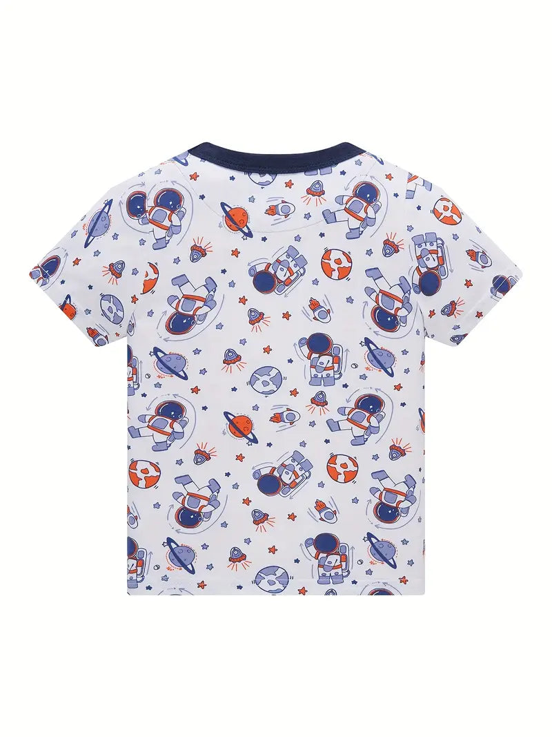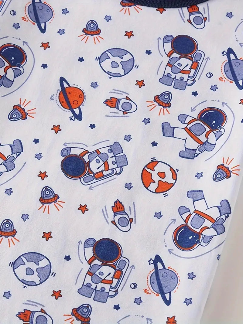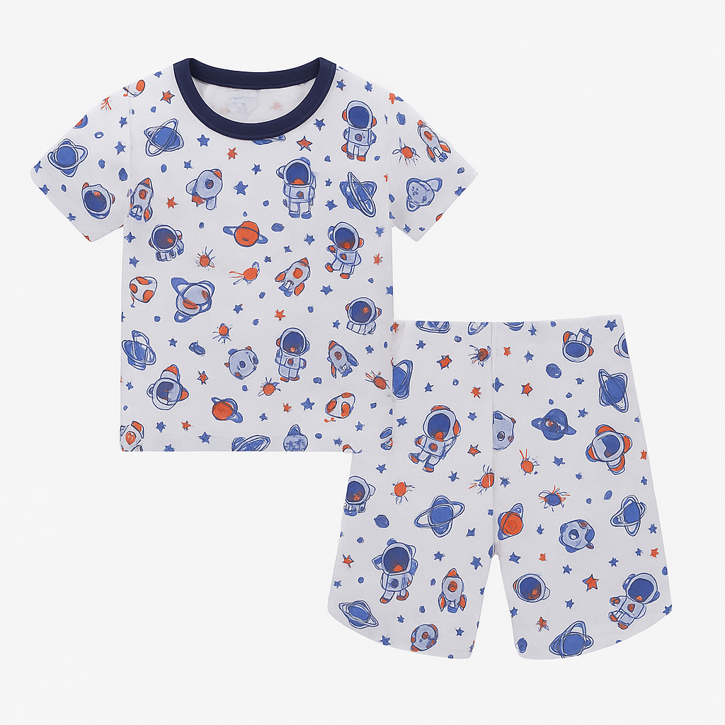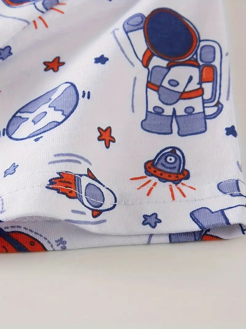 Lehoučké letní pyžamo s krátkým rukávem a šortkami je poseté planetami, hvězdami a roztomilými astronauty.