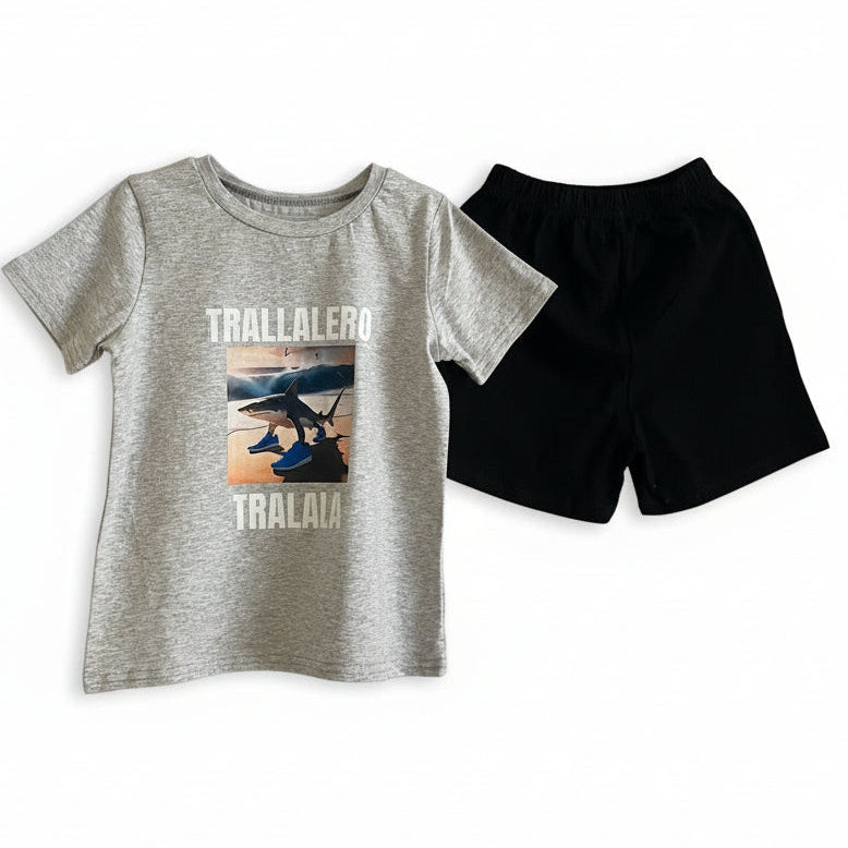Hravý a pohodlný dětský set Tralaléro Tralalà je ideální pro všechny malé fanoušky italského BrainRotu. Kombinace bílého trička s výrazným motivem Strelalero Trelalà a černých kraťásků je perfektní jak na spaní, tak i na celodenní nošení doma.