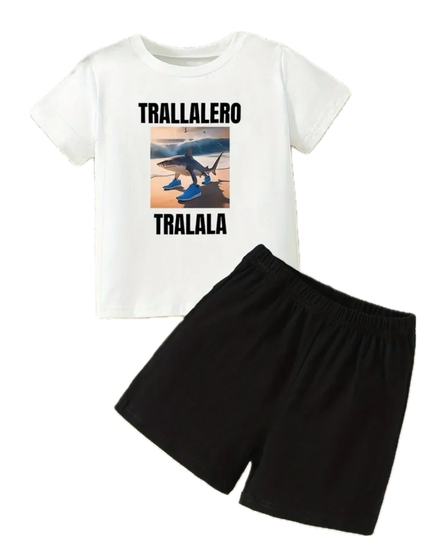 Hravý a pohodlný dětský set Tralaléro Tralalà je ideální pro všechny malé fanoušky italského BrainRotu. Kombinace bílého trička s výrazným motivem Strelalero Trelalà a černých kraťásků je perfektní jak na spaní, tak i na celodenní nošení doma.