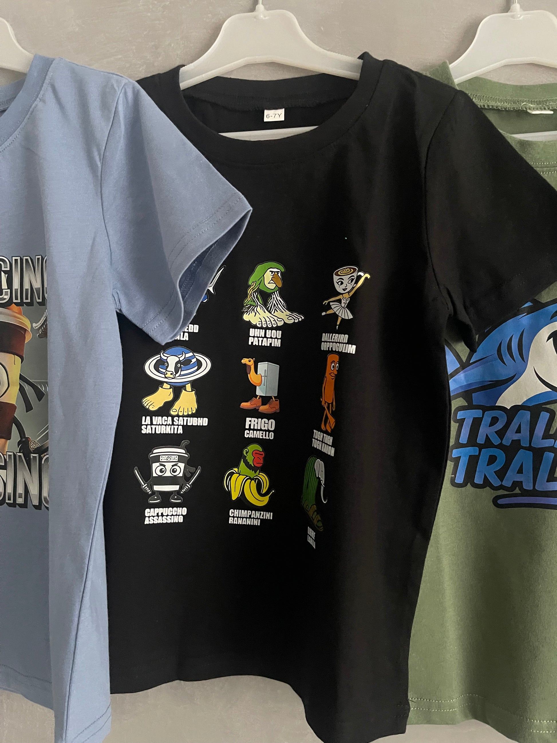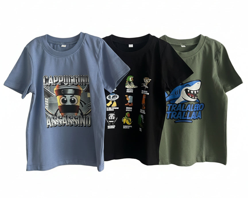 Set 3 dětských triček – Italský BrainRot | Cappuccino Assassino Brainrot figurky Tralalero Trallalá